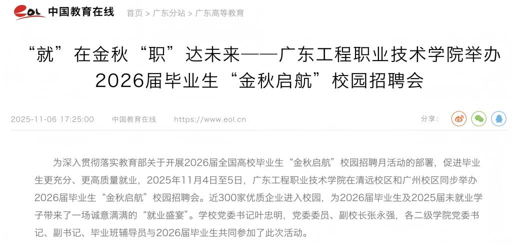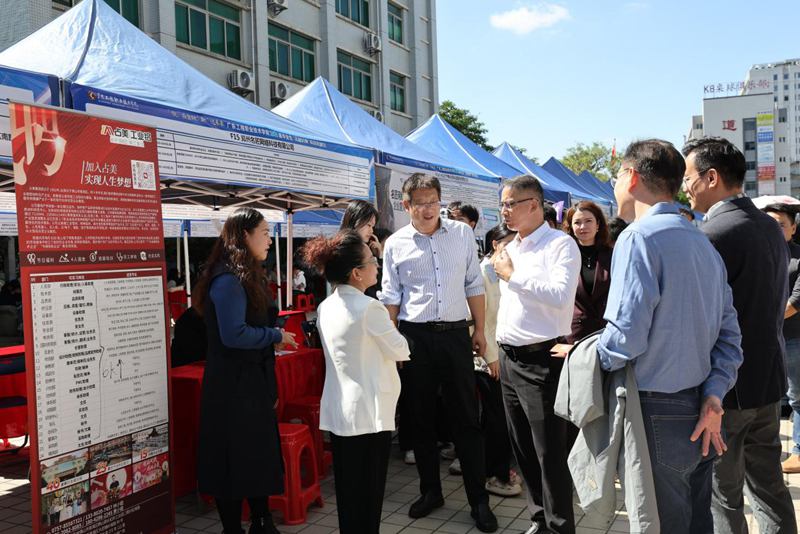 为深入贯彻落实教育部关于开展2026届全国高校毕业生“金秋启航”校园招聘月活动的部署,促进毕业生更充分、更高质量就业,2025年11月4日至5日,广东工程职业技术学院在清远校区和广州校区同步举办2026届毕业生“金秋启航”校园招聘会。近300家优质企业进入校园,为2026届毕业生及2025届未就业学子带来了一场诚意满满的“就业盛宴”。学校党委书记叶忠明,党委委员、副校长张永强,各二级学院党委书记、副书记、毕业班辅导员与2026届毕业生共同参加了此次活动。