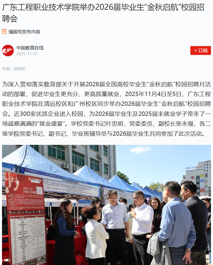 为深入贯彻落实教育部关于开展2026届全国高校毕业生“金秋启航”校园招聘月活动的部署,促进毕业生更充分、更高质量就业,2025年11月4日至5日,广东工程职业技术学院在清远校区和广州校区同步举办2026届毕业生“金秋启航”校园招聘会。近300家优质企业进入校园,为2026届毕业生及2025届未就业学子带来了一场诚意满满的“就业盛宴”。学校党委书记叶忠明,党委委员、副校长张永强,各二级学院党委书记、副书记、毕业班辅导员与2026届毕业生共同参加了此次活动。
