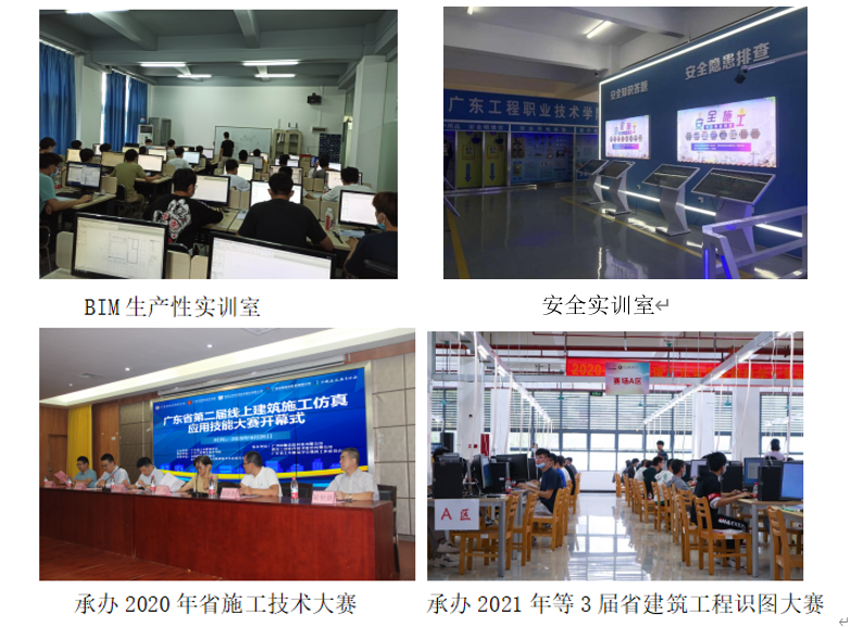 本专业拥有教育部认定的建筑工程技术专业(群)“双师型”教师培养培训基地和广东省级实训基地各1个,包括建筑材料、BIM技术应用等实体和虚拟实训室,与远大住工集团、广东华标工程检测中心等企业共建校内外实训基地多处,满足学生实训、实习的需求。拥有土建八大员培训考点和中国图学会BIM技能等级考证点,承办了2021-2022年度等3届广东省职业院校建筑工程识图竞赛等。