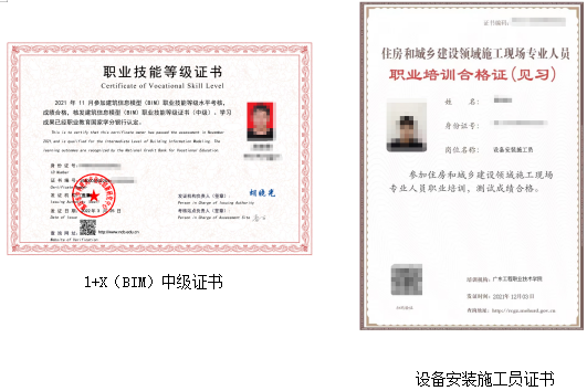 基于建筑工程学院所拥有的土建八大员培训考点和中国图学学会BIM技能等级考证点,建筑设备工程技术专业学生在校内即可完成相关技能证书的考取。