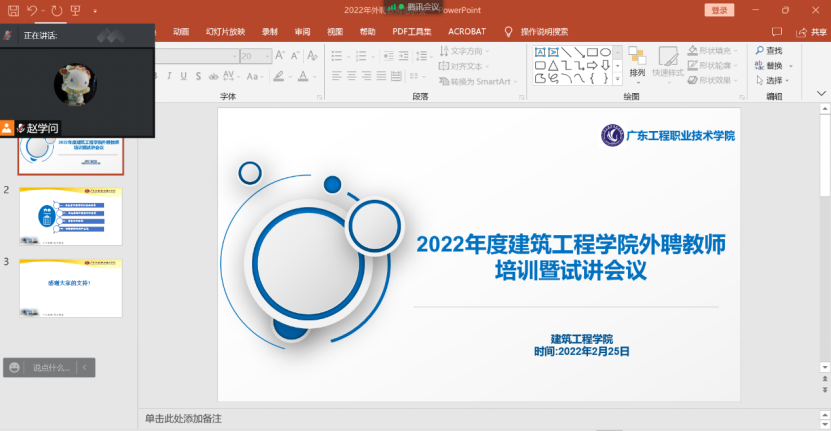 为进一步加强外聘教师管理和提升外聘教师教育教学水平,建筑工程学院于2022年2月25日通过腾讯会议在线召开了2022年度外聘教师培训暨试讲会.教务员、专业主任和24名外聘教师参加了会议,会议由建筑工程学院副院长赵学问主持。