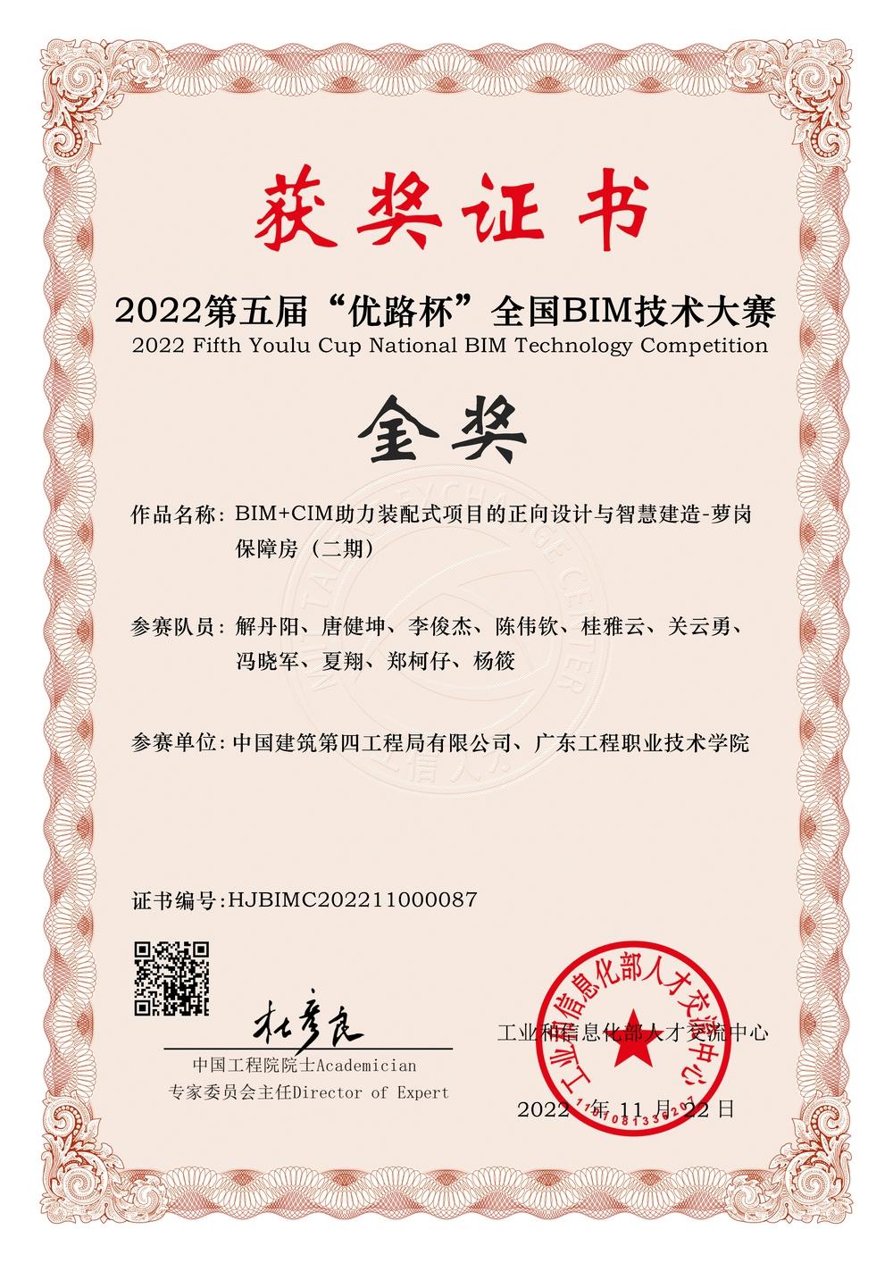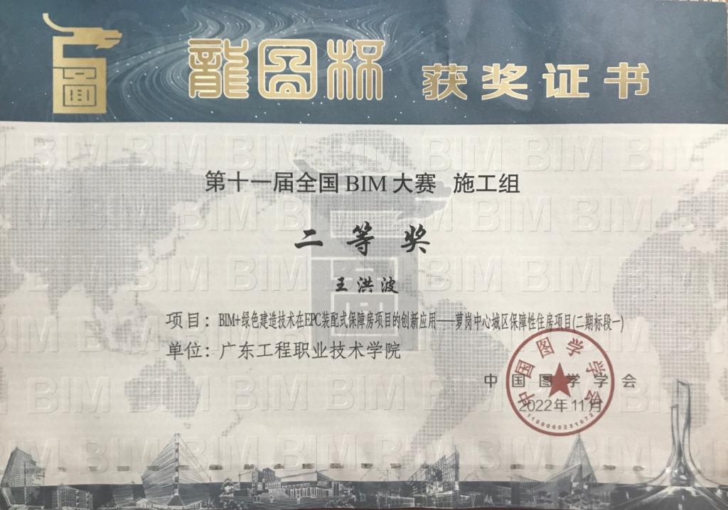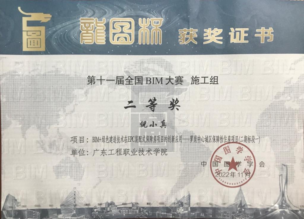建筑工程学院与校企合作单位中国建筑第四工程局有限公司联名报送的作品 “BIM+绿色建造技术在EPC装配式保障房项目的创新应用——萝岗中心城区保障性住房项目(二期标段一)”在2022年第十一届“龙图杯”全国BIM(建筑信息模型)大赛获得施工组二等奖;基于同一项目的另一个作品 “BIM+CIM助力装配式项目的正向设计与智慧建造——萝岗保障房(二期)”在2022年度第五届“优路杯”全国BIM技术大赛获得企业组装配式方向金奖。