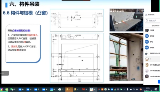最后,汪嫄全导师聚焦“构件吊装”这一核心施工环节,从塔吊选型、吊具准备、施工计划到具体构件的吊装流程,逐一展开说明。他特别强调了凸窗与铝模协同施工、叠合板与机电管线配合等现场常见问题的处理方式,并结合首层吊装经验,总结了多项实用技术要点与安全注意事项。