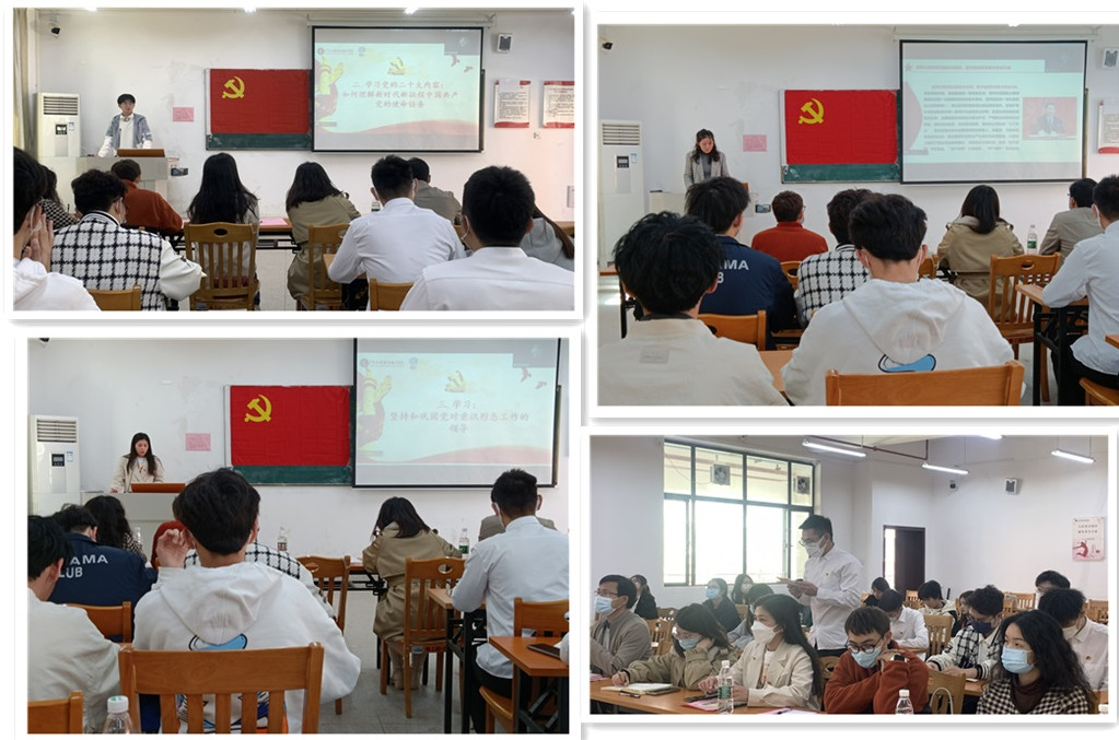 会议伊始,龙洁爽领学《求是》杂志的重要文章《全面从严治党探索出依靠党的自我革命跳出历史周期率的成功路径》,勉励全体党员把对马克思主义的信仰,对中国特色社会主义的信念,对实现中华民族伟大复兴中国梦的信心内化于心、外化于行,共同写好不负时代、不负人民的合格答卷。学生第二党支部书记万理带领全体党员学习《如何理解新时代新征程中国共产党的使命任务》时表示,我国发展面临新的战略环境,必须增强忧患意识,坚持底线思维,做到居安思危未雨绸缪,始终把中国发展进步的命运牢牢掌握在自己手上。会上,大家还学习了《习近平谈治国理政》(第二卷)《坚持和巩固党对意识形态工作的领导》有关内容。学生第一党支部书记张伟群强调,党员同志要增强政治意识,要与党中央保持高度一致,在日常学习、工作和生活中要充分发挥党员先锋模范带头作用,积极向上,关心帮助同学。