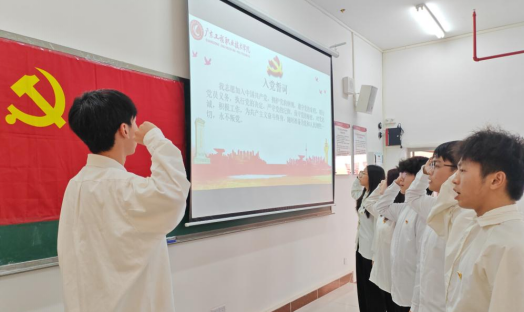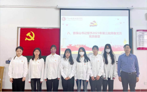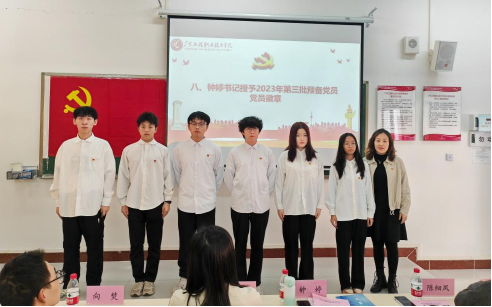 紧接着,钟婷、晋保山分别给学生第一、第二党支部2023年第三批预备党员授予党徽。随后,胡凯、杨洁两名预备党员代表分别作为学生第一、第二党支部的领誓人,带领2023年第三批预备党员宣读了入党誓词。