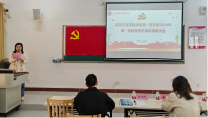 为充分发挥党建统领作用,加强基层党组织建设,助力学校、学院高质量发展,建筑工程学院学生第一、第二党支部于2024年1月5日下午分别在Q1-214、Q1-215教室召开了2024年第一批预备党员接收通表大会。参加大会的有建筑工程学院党委书记钟婷、副书记晋保山,组织员陈细凤,学生第一党支部书记张伟群、学生第二党支部书记万理,以及两支部全体师生党员和发展对象,会议分别由张伟群和万理主持。