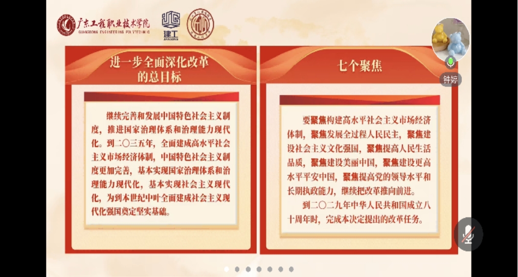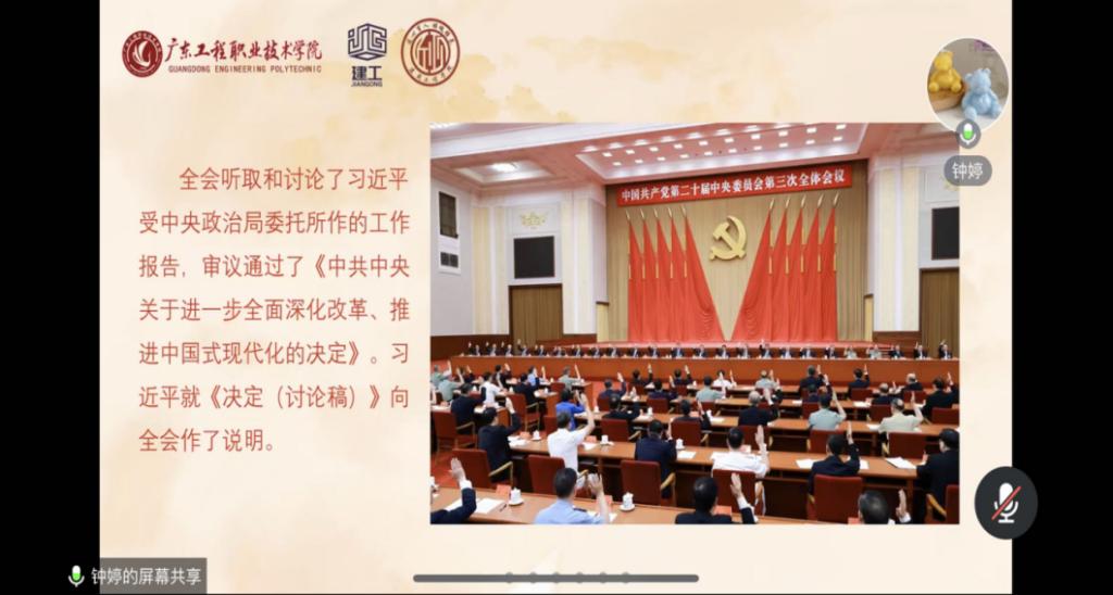 随后,学院党委书记钟婷就“学习贯彻党的二十届三中全会精神”开展了领学,并向全体党员传达了《中国共产党第二十届中央委员会第三次全体会议会报》的指示精神。在领学过程中,她强调:两支部全体党员要深入学习习近平总书记关于全面深化改革的一系列新思想、新观点、新论断,完整准确贯彻新发展理念要求,在学习上坚持解放思想、实事求是、守正创新、求真务实的进取精神,在工作中更加注重系统集成、更加注重突出重点,更加注重成果实效,积极将新发展理念同学校高质量发展深度融合,在新形势下不断深化我院“匠心育人 铸魂强基”党建文化品牌建设,助力学校建高升本长足发展。