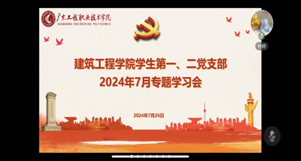 为贯彻落实党的二十届三中全会作出的战略部署,深度落实基层党组织对全会精神的学习领会,建筑工程学院学生第一、第二党支部于2024年7月26日晚通过腾讯会议的形式召开了党的二十届三中全会精神专题学习会。学院学生第一、第二党支部全体师生党员参会,会议由学生第一党支部书记张伟群主持。