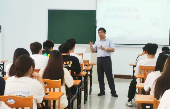 学院院长王洪波聚焦“国际形势与中国原则立场”主题,以中美关系作为切入点,从“动荡变革的世界”、“全球瞩目的热点”、“大国风范的外交”三个方面展开讲解,引导同学们认识历史之变正以前所未有的方式展开,世界进入新的动荡变革期,中国始终站在历史正确的一边、时代进步的一边,不断为世界注入宝贵的稳定性和正能量,为维护世界和平、促进共同发展作出新的贡献。他寄语青年学子,要努力学习专业知识,深刻把握国际社会变化的深刻性、复杂性,深入认识中华民族伟大复兴在国际层面面临的挑战,自觉担负起时代的责任,努力做具有远大理想和坚定信念的新时代青年。
