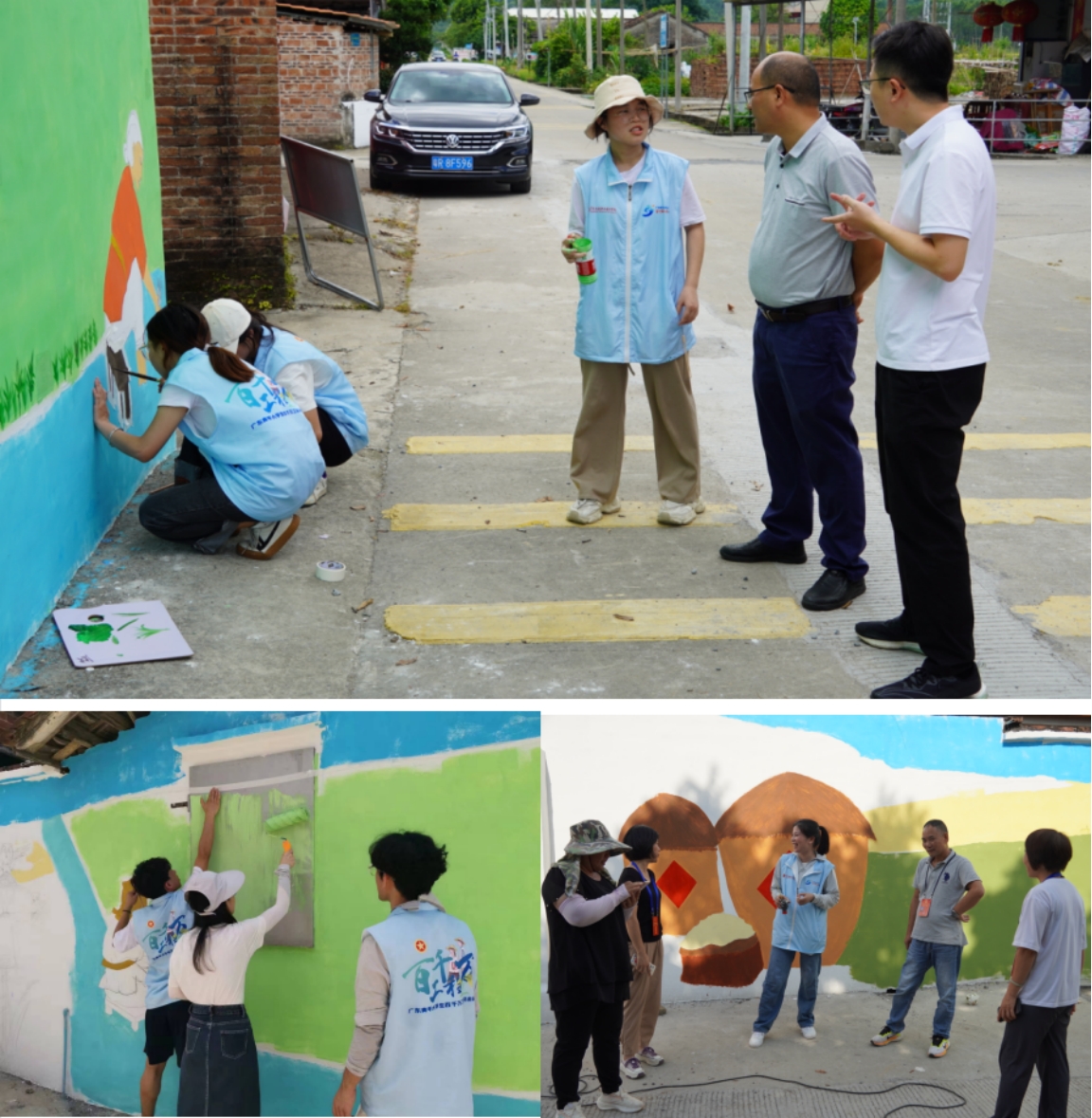 7月14日,在指导老师带领下,实践铸青春突击队一行11人正式开拔清远市清新区山塘镇恒平村。到达目的地后,突击队成员根据前期讨论研究情况,开始根据墙体情况,围绕当地农耕特色对墙面进行描绘。村民们对突击队的到来表示欢迎,主动给顶着烈日绘画的队员送上风扇、遮阳伞等,缓解夏日的炎热,并主动邀请他们对自家墙体进行绘画,还有不少村民、儿童主动加入墙绘活动,为和美乡村增添了一道靓丽的风景线。期间,山塘镇党委副书记潘汉锋,党政和人大办主任罗幸锋,山塘镇团委副书记欧钰以及村委干部等来到现场指导,对此次活动给予高度评价,与团队成员亲切交流,提醒做好防暑防晒措施,并参与到墙绘实践中。
