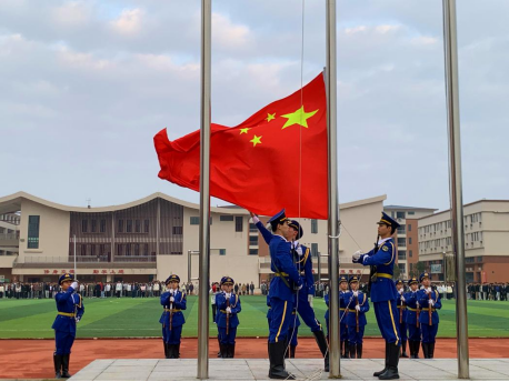 上午7时20分,升旗仪式在主持人郭俊杰铿锵有力的开场词中拉开帷幕。国旗护卫队迈着整齐划一的步伐护送国旗入场,伴随着雄壮的《义勇军进行曲》,鲜艳的五星红旗冉冉升起。全体师生肃立行注目礼,齐声高唱国歌,嘹亮的歌声回荡在运动场上空,传递着对祖国的深情礼赞。