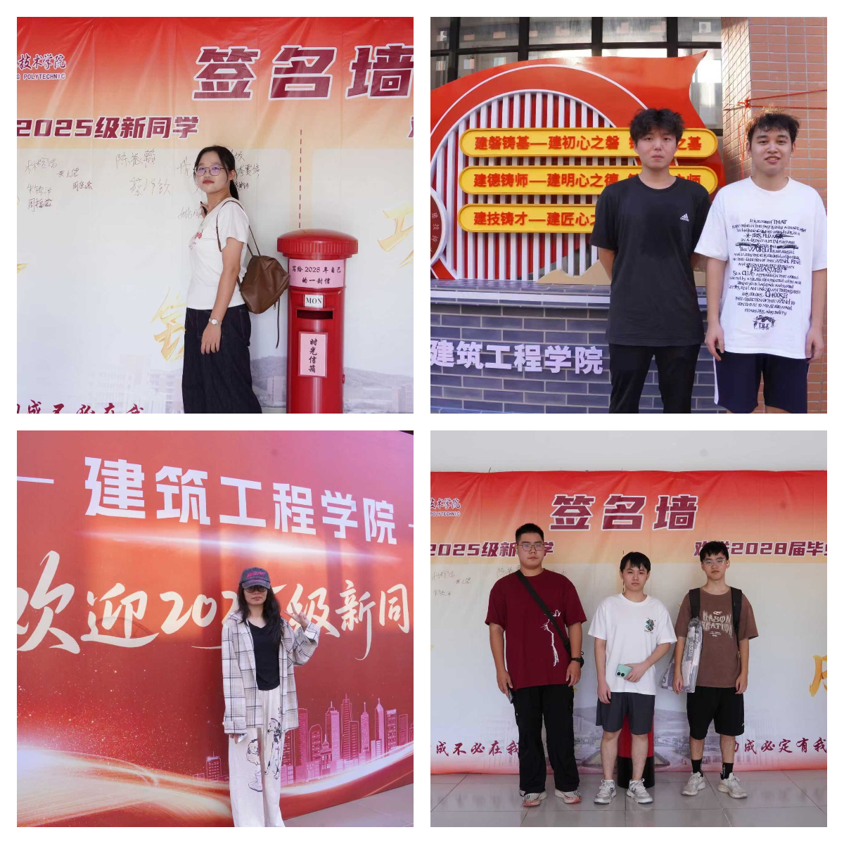 学院今年的迎新工作以全新的党建文化品牌“建铸功成”为引领,在传统流程基础上创新设置了多个主题互动区域:“建磐铸基”打卡点将党建教育与新生入校仪式相结合,同学们纷纷在展板前合影并留言表达大学愿景,在仪式感中强化理想信念;“建德铸师”区邀请学院教师、班主任现场答疑,帮助新生感知师者风采、树立学业目标;“建技铸才”体验区则设有“时光邮筒·筑梦家书”以及“建铸功成”签名墙签名环节,新生可亲手书写《致三年后的我》信件,投入定制邮筒,等待毕业典礼时启封回顾,寓意深刻、温情满满。同时,新生可在定制的签名墙上签上自己的名字及祝福,记录专属于自己的“新生”时刻。