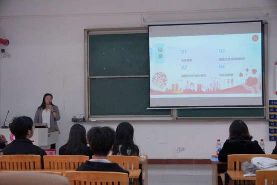 会上,学院资助经办老师胡文梅从发布背景、感恩积分与劳动教育的关系、感恩积分内涵与要求等方面对《建筑工程学院受资助学生“匠心育人”感恩积分管理办法》(以下简称“办法”)进行了解读,鼓励引导学院受资助的同学积极实践,以青春之我投身劳动实践和志愿活动,在服务他人中懂得珍惜,在回馈集体中学会担当。
