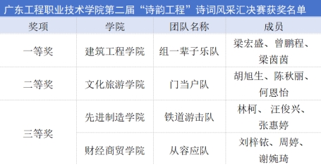为持续弘扬中华优秀传统文化,深耕校园文化沃土,激发学子对古典诗词的热爱与传承热情,2025年12月23日,由建筑工程学院承办的广东工程职业技术学院第二届“诗韵工程”诗词风采汇决赛在省职教城校区Q1-228如期举行。来自各学院的诗词爱好者齐聚一堂,以诗为媒、以词会友,共同演绎中华诗词的独特魅力。建筑工程学院党委书记钟婷、学生工作部(招生与就业指导中心)副部长李家标、建筑工程学院党委副书记石来斌、各学院辅导员代表及建筑工程学院全体辅导员出席了此次活动。