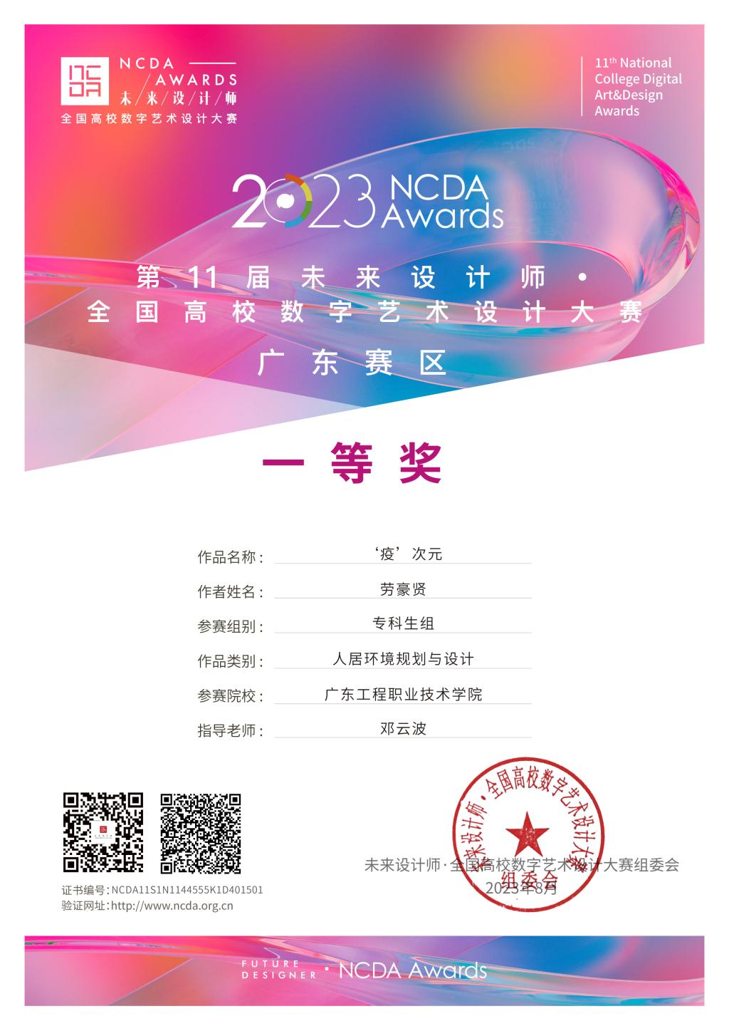 近日,2023 第 11 届未来设计师·全国高校数字艺术设计大赛(NCDA)全国总决赛落下帷幕,由建筑工程学院建筑室内设计专业教师邓云波指导的作品《‘疫’次元》在近29万件作品中脱颖而出,获国赛一等奖。另外在省级赛事中,我院学生分别荣获一等奖1项、二等奖1项、三等奖1项。
