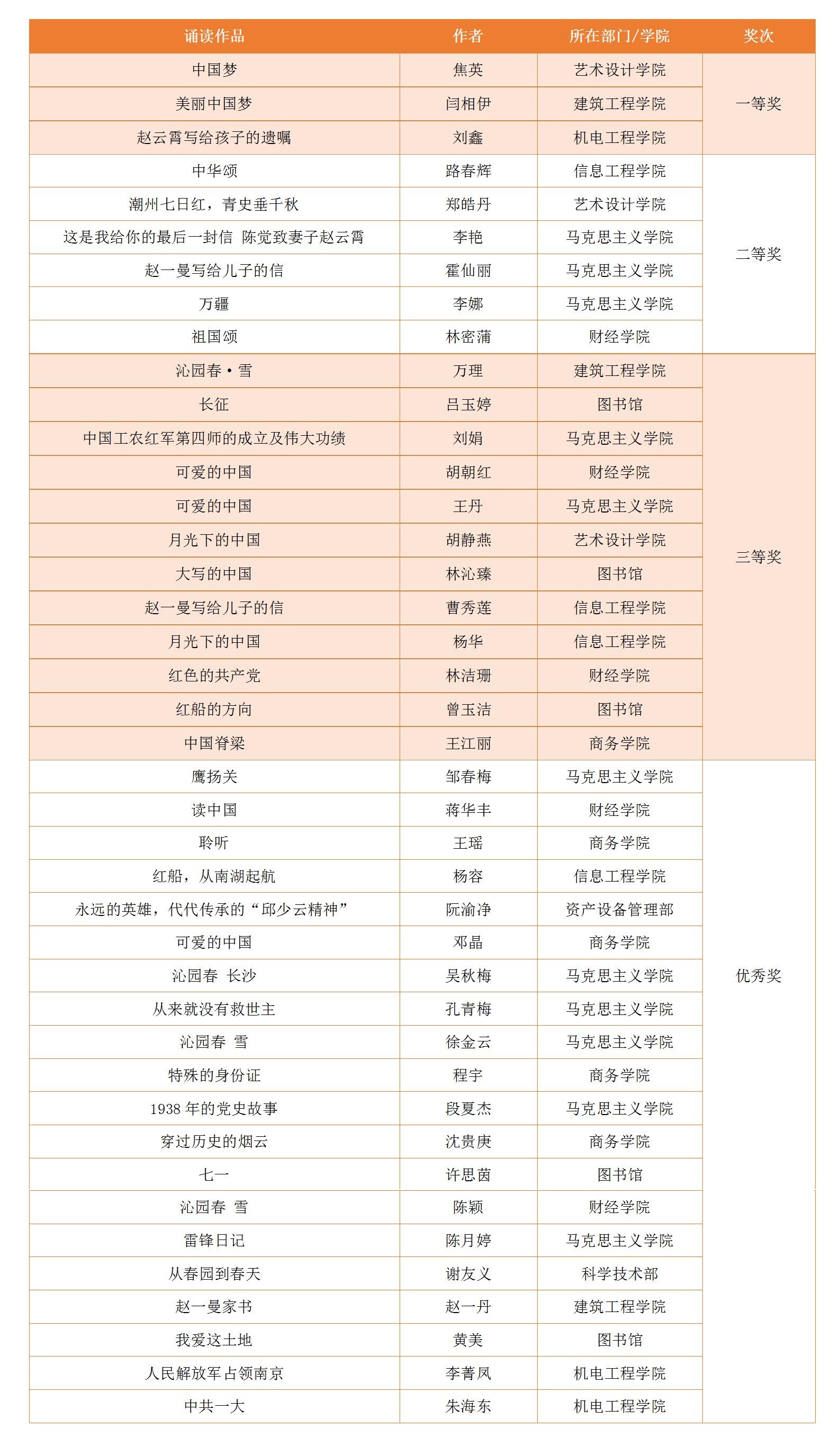 活动收到众多优秀作品,经过宣传部(武装部)、工会、图书馆三部门组织校内专家进行评分,艺术设计学院焦英、建筑工程学院闫相伊、机电工程学院刘鑫3位老师荣获一等奖,信息工程学院路春辉等6位老师荣获二等奖,建筑工程学院万理等12位老师荣获三等奖,马克思主义学院邹春梅等20位老师荣获优秀奖。具体获奖名单如下: