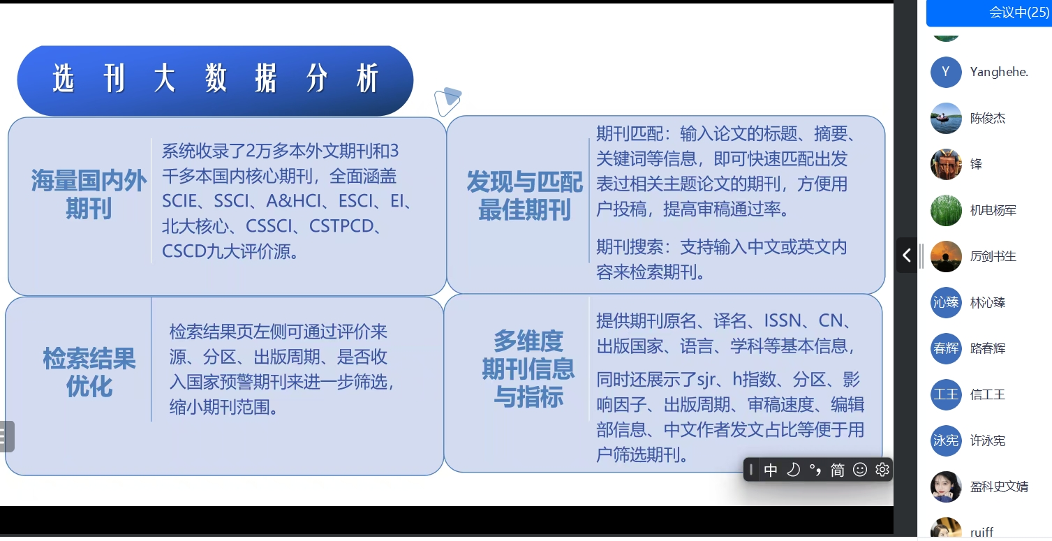 4月29日的中国知网使用指南线上培训中,中国知网讲师肖芳老师结合我校专业设置和师生读者使用习惯,重点讲解并演示知网知识服务平台,以及如何利用平台进行查找资料、具体的检索技巧分析,高效笔记整理、实用工具利用等问题。培训内容切合我校读者的需求,获得参会读者的一致好评。