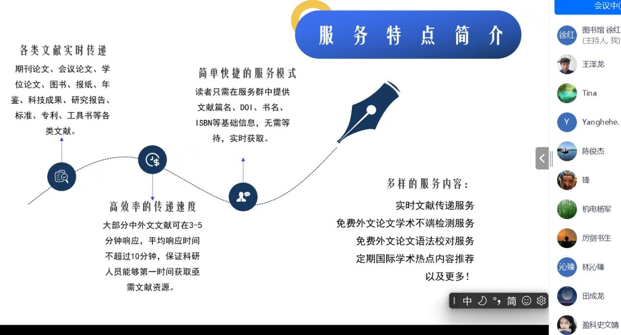5月8日的“青梨AI科研服务助手使用方法”专题讲座中,盈科千信公司的王泽龙老师向大家介绍了青梨AI科研服务助手,它依托于微信小程序和学科服务群,以全新形式为科研教学人员打造智能高效的专属学科服务,使老师们在科研发文、文献调研、学术追踪中遇到的问题迎刃而解,提供更加强大的学术资源保障。讲座内容切合我校教师的需求,获得参会教师的一致好评。