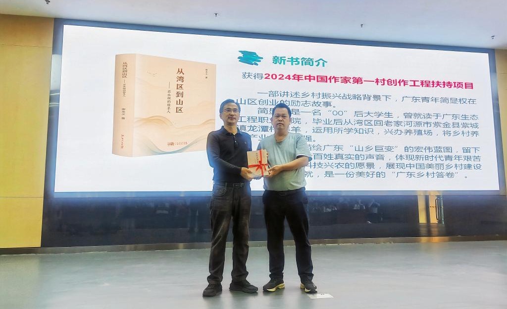 随后,广东省报告文学学会副会长兼秘书长谢友义带来了题为《文学赋能圆创业梦想》的主题分享。他结合自己的创作经历,特别是2024年中国作家第一村创作工程扶持项目、长篇报告文学《从湾区到山区——石头坝的牧羊人》的采访和创作过程,深情地描绘了简显权如何返乡创业、如何在艰难的环境中坚守使命与责任,将青春绽放在大山深处,成为乡村振兴的楷模和新时代的平民英雄。