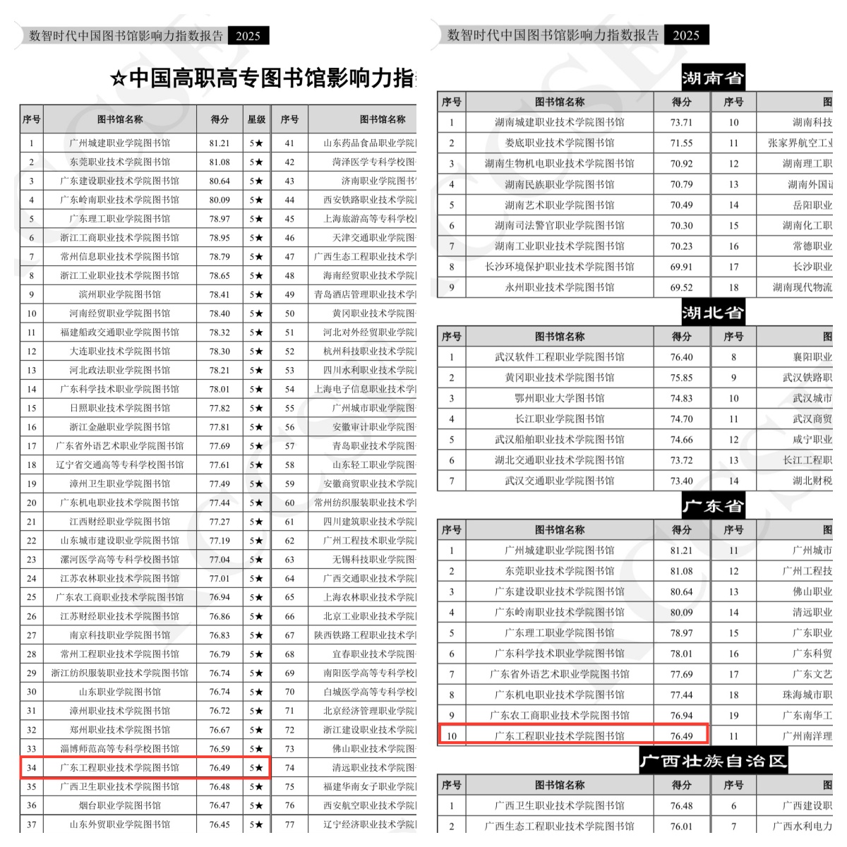 近日,由武汉大学中国科学评价研究中心、数字出版智能服务技术教育部工程研究中心联合研发的《数智时代中国图书馆影响力指数报告(2025版)》正式发布。我校图书馆在全国1554所高职高专院校图书馆中脱颖而出,首次获得5★等级评价,位列“中国高职高专图书馆影响力指数”第34名、广东省第10名,较上一年度的4★等级、排位第193名实现跨越式提升,体现了图书馆综合建设水平迈上新台阶。