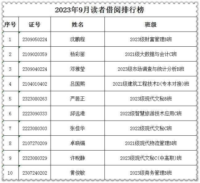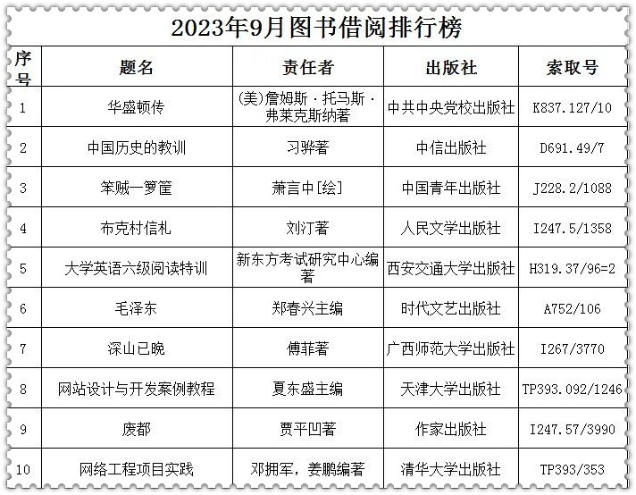 图书馆2023年9月份读者借阅排行榜和图书借阅排行榜出炉啦,快来看看最近哪几本书借阅量最大,或者来这里找找有没有你想借的书!谁是名副其实的读者?谁往图书馆跑的最勤快?谁的借阅量最大?快在上面的排行榜里找找有没有自己的名字吧!
