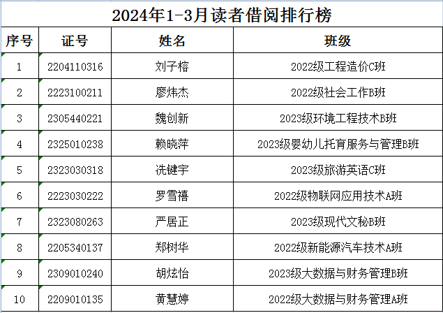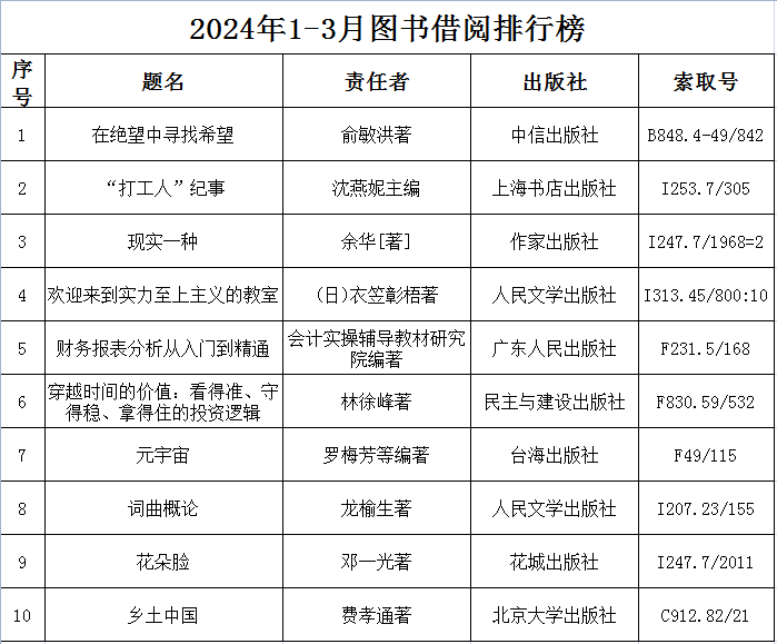 图书馆2024年1-3月读者借阅排行榜和图书借阅排行榜出炉啦,快来看看最近哪几本书借阅量最大,或者来这里找找有没有你想借的书!谁是名副其实的读者?谁往图书馆跑的最勤快?谁的借阅量最大?快在上面的排行榜里找找有没有自己的名字吧!