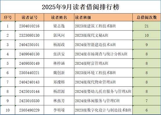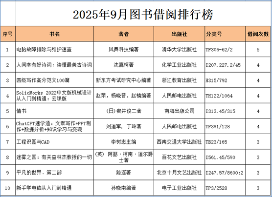 2025年9月图书借阅排行榜和读者借阅排行榜出炉啦,快来看看最近哪几本书借阅量最大?谁往图书馆跑的最勤快?谁的借阅量最大?快在下面的排行榜里找找有没有自己的名字吧!