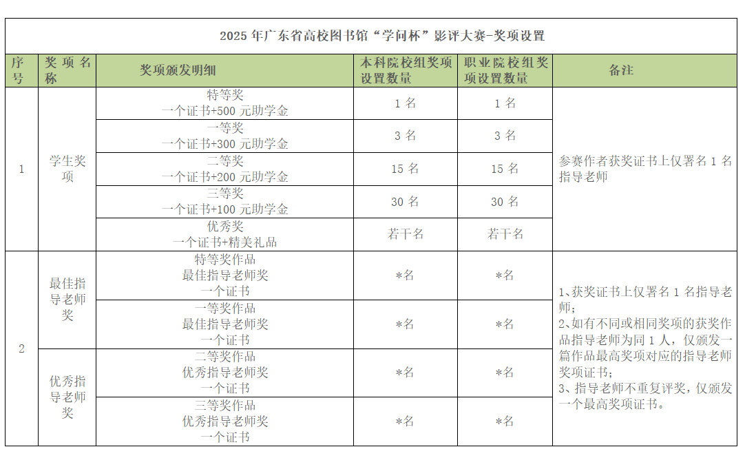 本科院校组和职业院校组分别设特等奖(1名)、一等奖(3名)、二等奖(15名)、三等奖(30名)、优秀奖(若干名)。通过初评的作品视为入围作品,最终奖项将从入围作品中产生。