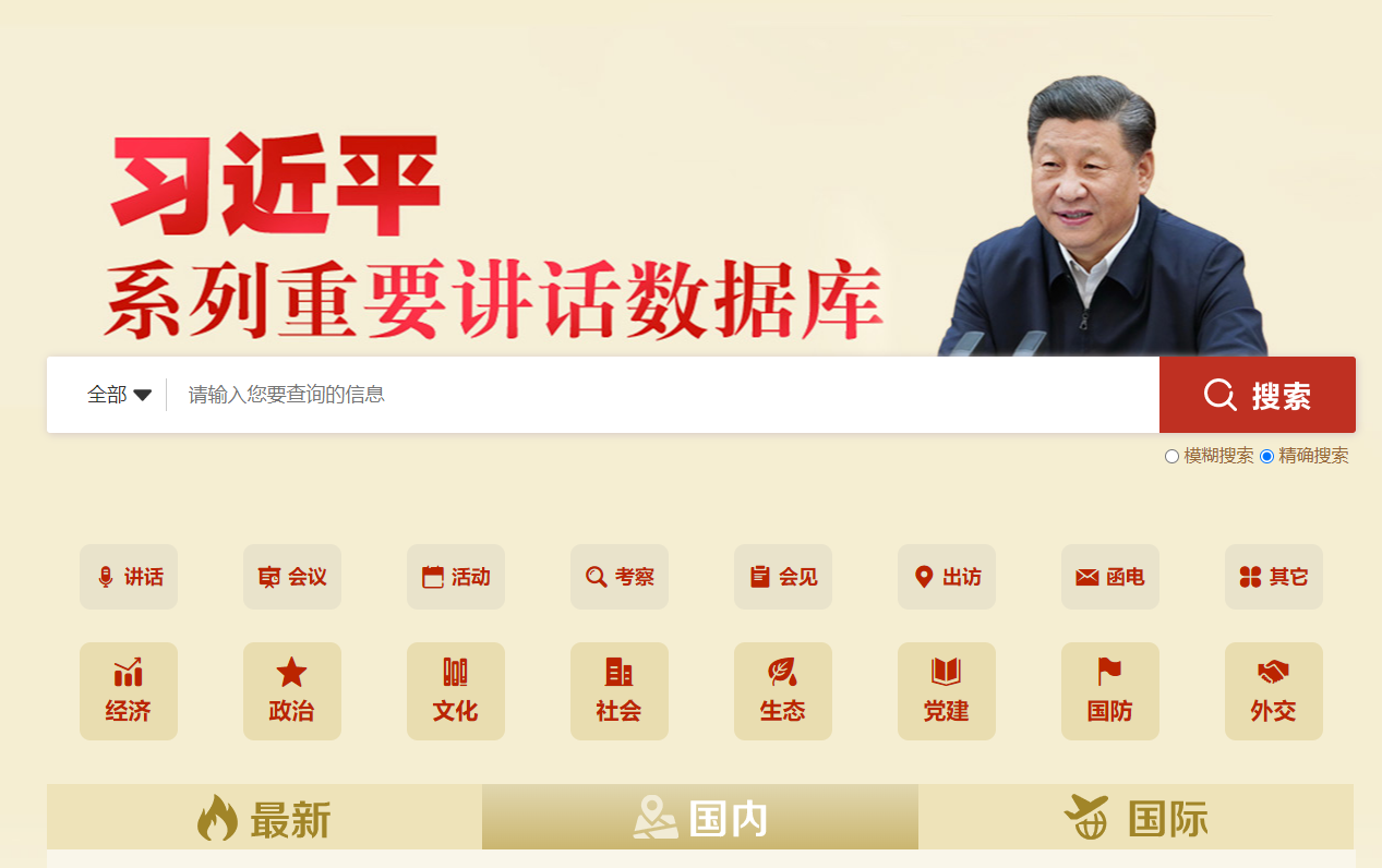 由中央网信办指导、人民网·中国共产党新闻网建设,是互联网上首个以数据库形式向广大网友宣传和推介习近平总书记重要讲话的专栏。适应新的媒体环境下平台化、可视化、定制化的趋势,数据库实现了新闻发布、信息检索、动态交互、资料分享、手机阅读等多重功能。