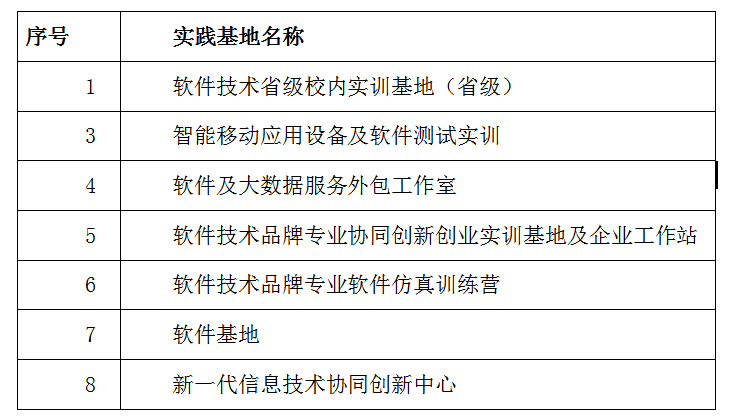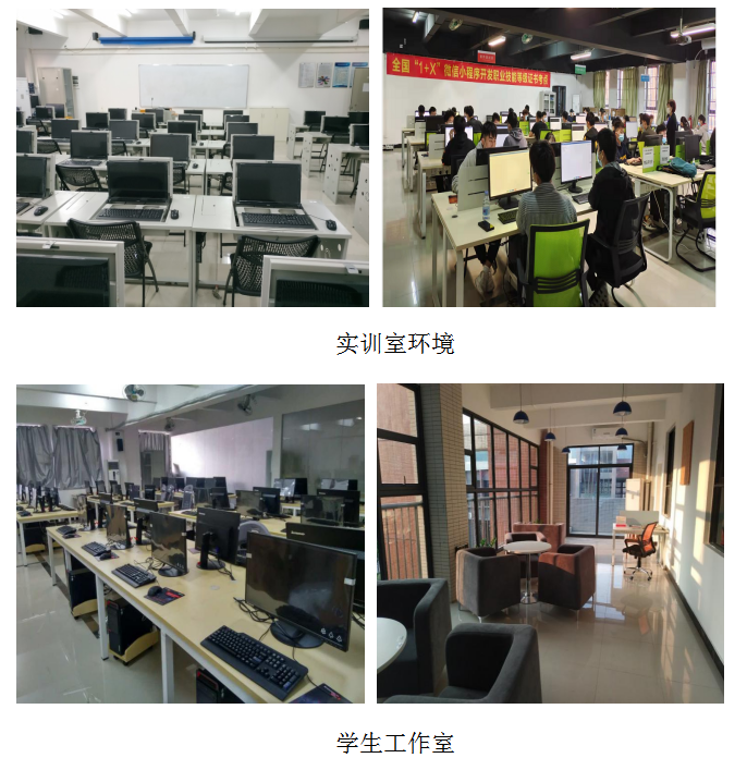 软件技术专业具有软件技术省级校内实训基地、1个省级公共实训中心,智能移动应用设备及软件测试实训室、软件及大数据服务外包工作室、软件技术品牌专业协同创新创业实训基地及企业工作站、软件技术品牌专业软件仿真训练营、新一代信息技术协同创新中心、软件基地等15个实训室。校内实训基地目前承担了本专业600多名学生的软件与信息技术服务等基础知识和专业课的实训任务,能基本满足软件开发、电子商务网站开发、软件测试、移动互联网、图形图像处理、计算机辅助网络工程设计等基础性的实训教学任务。