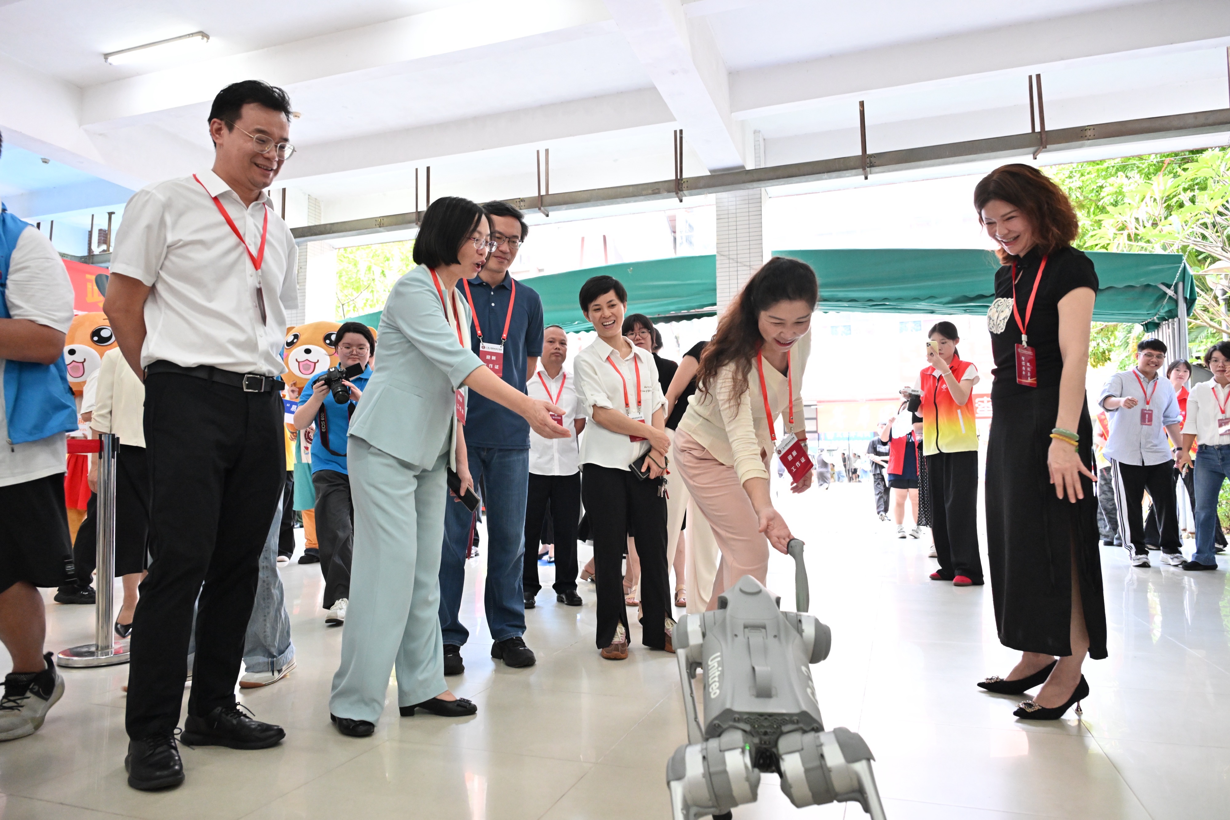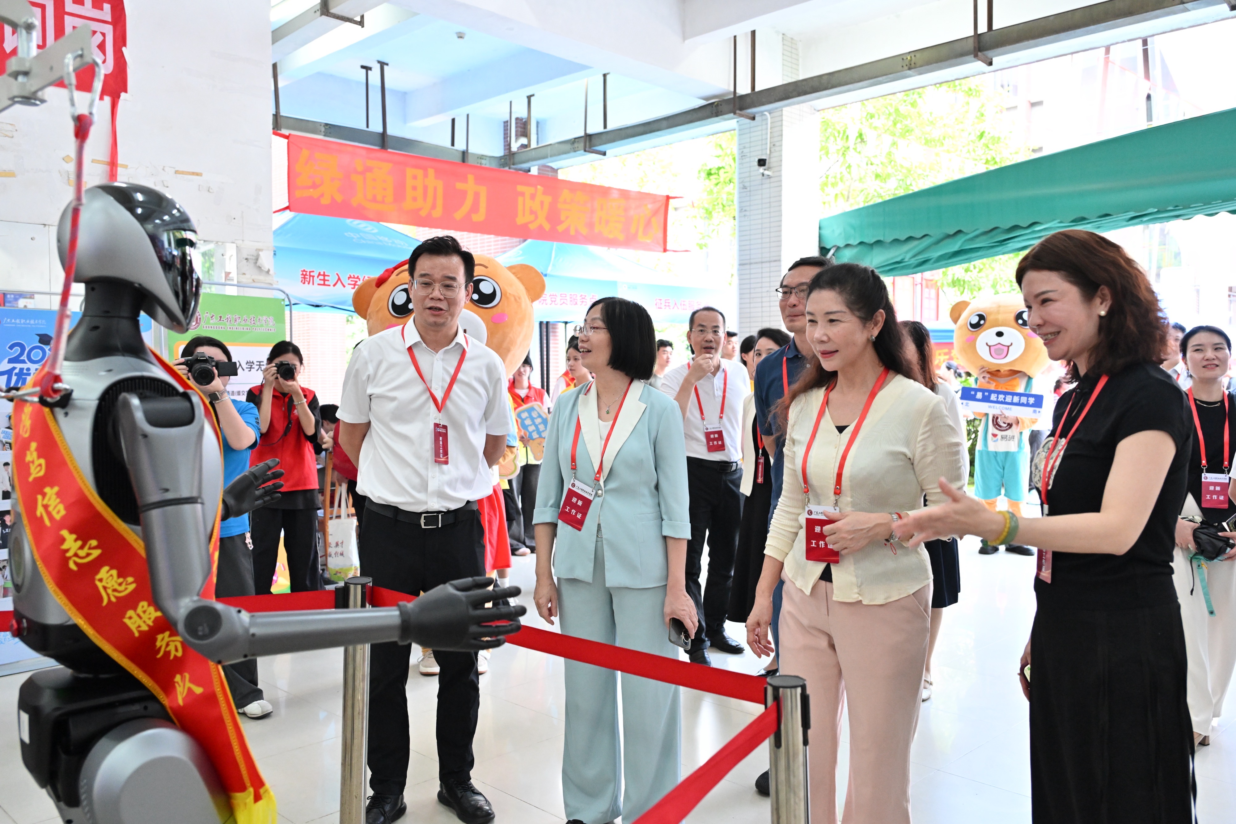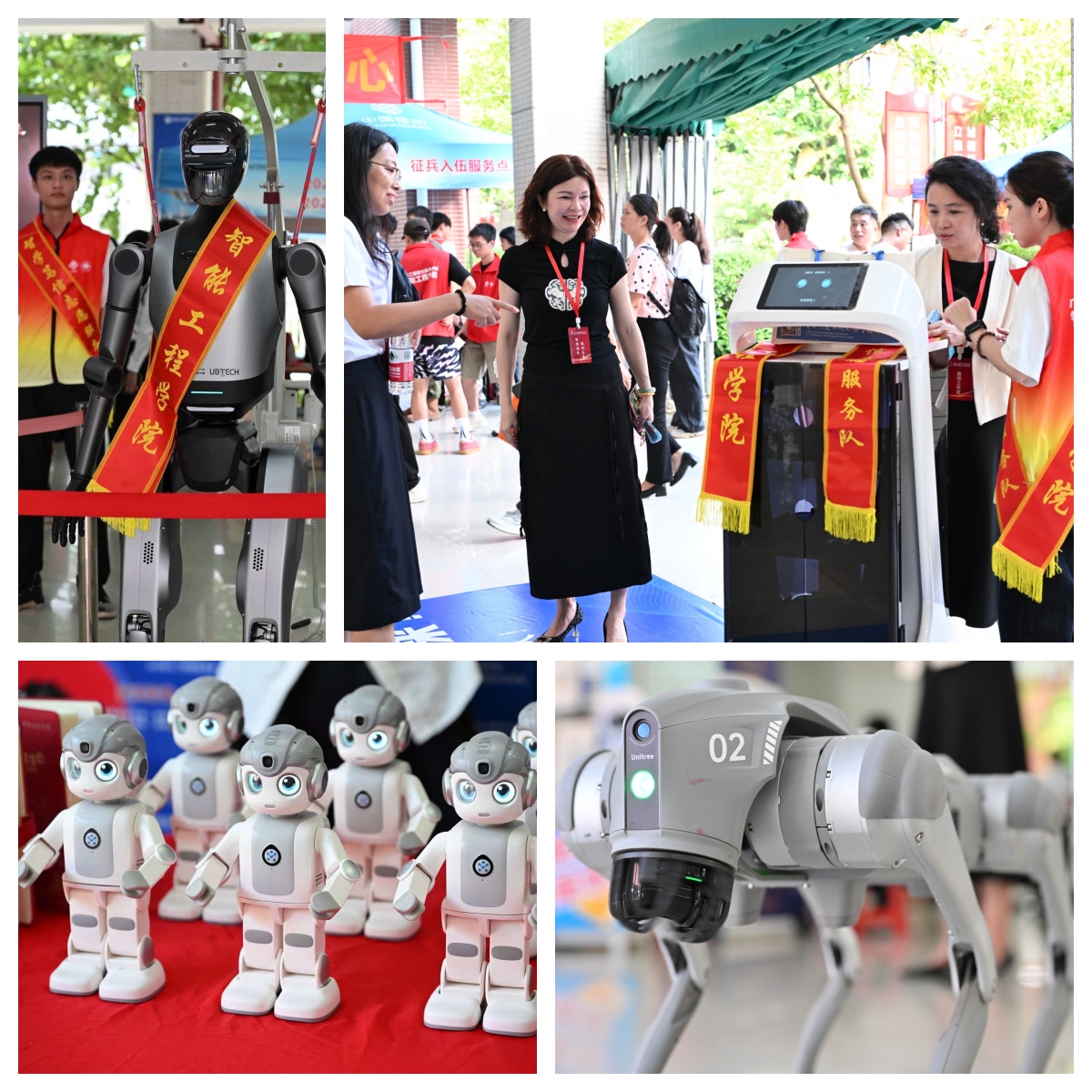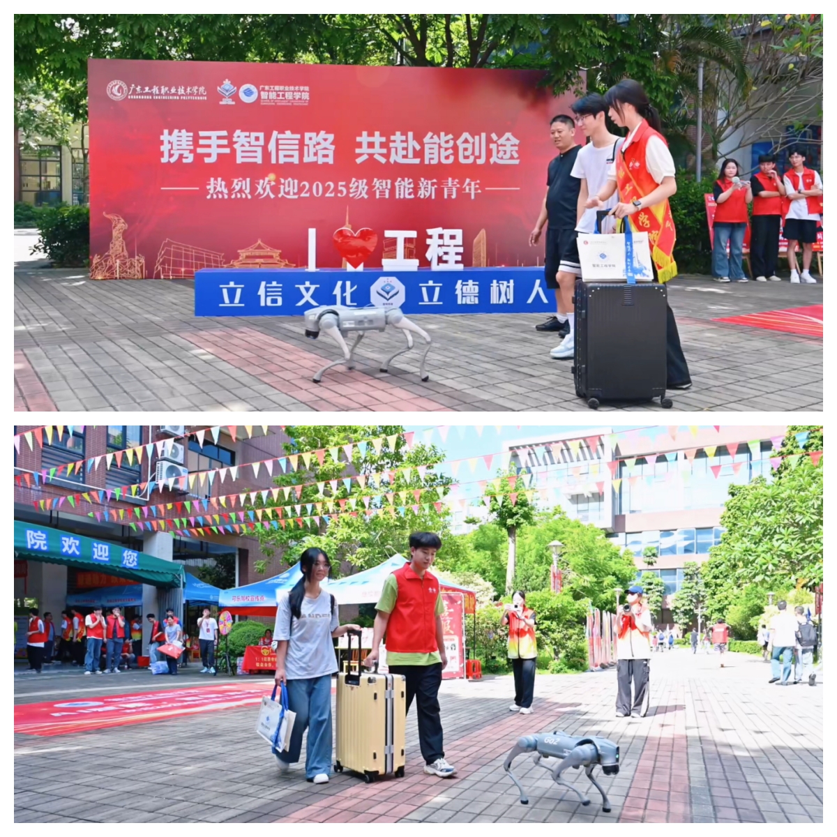 智能工程学院迎新现场,不仅是一个报到点,更是一个浓缩的前沿科技秀场。人形机器人、数字人、机器狗、机械臂从实验室走到新生和家长身边,让校园开放日成为大学第一堂“看得见、摸得着”的专业导论课。学院充分融合专业特色,由各专业负责人携手企业名师将“智能化”“信息化”理念贯穿始终,打造了一场兼具科技感与人文关怀的智慧迎新。在迎新现场,学院特别设置了“智能互动体验区”,展示了由校企合作研发的智能搬运机器人、人脸识别系统等创新作品。新生们纷纷驻足、动手体验,在沉浸式互动中感受智能科技的魅力,激发了对未来专业学习的浓厚兴趣。“没想到刚来就能看到学院做的机器人,太酷了!我对自己的专业更有信心了!”一位智能产品开发专业的新生兴奋地说道。学院在迎新大本营设置了“智信迎新数字墙”,通过LED大屏实时滚动展示专业群建设、校园风光以及学院在人工智能、智能制造、机器人技术等领域的科研成果,让新生一进校门便感受到浓厚的科技氛围与学院实力。此外,学校进行智能报到升级,新生通过手机即可完成大部分报到流程,真正实现了“指尖报到、轻松入学”。