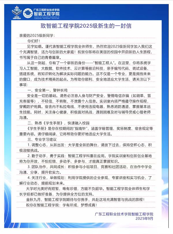 据悉,本届新生生源质量实现历史性突破!其中,物理类考生陈鹏盛同学高考成绩达494分,超本科线50余分,以优异的成绩选择了我院计算机网络技术(与嘉应学院三二分段)本科协同培养专业。与美国贝佛大学实施“3+1”联合合作,提升人才培养质量。更值得关注的是,学院报到率95.39%,其中云计算技术应用C班、大数据技术D班、计算机网络技术B班、人工智能技术应用A班4个班实现100%全员报到,体现了强大的专业吸引力,学院整体报到率较上一年有所提升。这一突破不仅是学院专业建设、招生宣传精准发力的成果印证,更与迎新工作的用心服务密不可分。此次迎新工作,智能工程学院坚持以学生为中心,以“智学笃信”党建与思政品牌为引领,将专业特色融入迎新全过程,用智慧提升效率,用真情传递温度,每一处细节都在向新生传递“选择智能工程学院,就是选择温暖与成长”的信念.