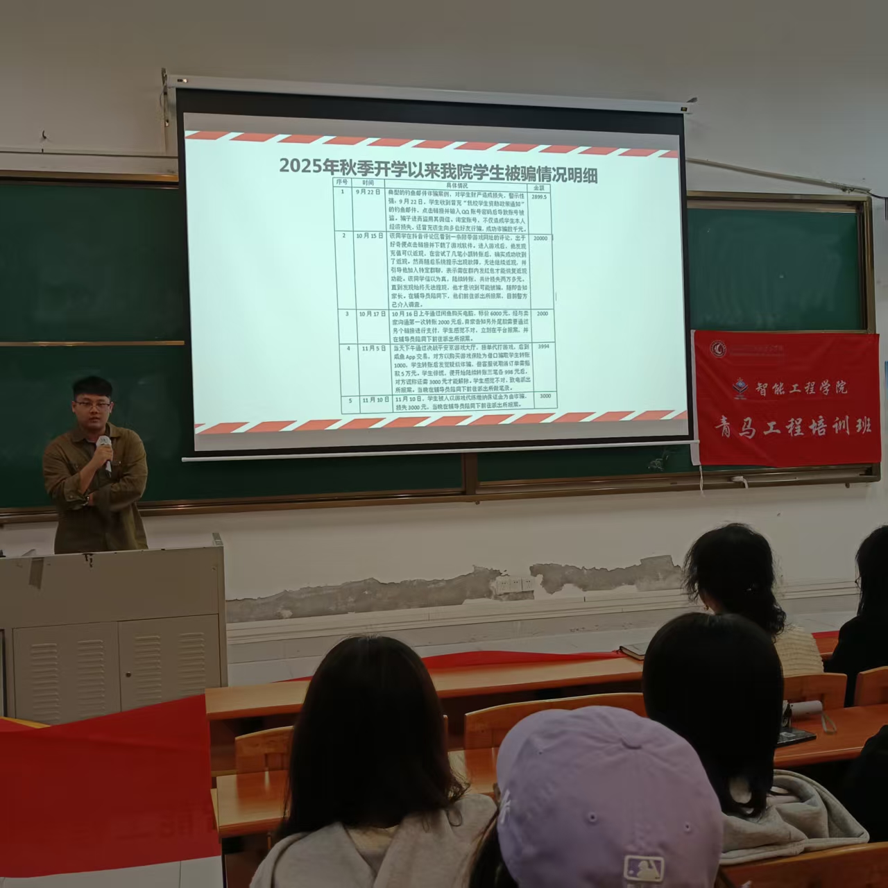 现场,学院安全员刘俊朗老师为同学们带来一堂干货满满的防诈普法课。他通过真实案例剖析,用“接地气”的语言详细讲解了刷单兼职、冒充客服、虚假购物、冒充公检法等7类高频骗局,现场播放的“受骗者自述”视频更让不少学员皱起眉头。他提醒同学们要时刻保持警惕,牢记“三不”口诀:“不轻信、不转账、不共享屏幕”,筑牢网络安全防线。