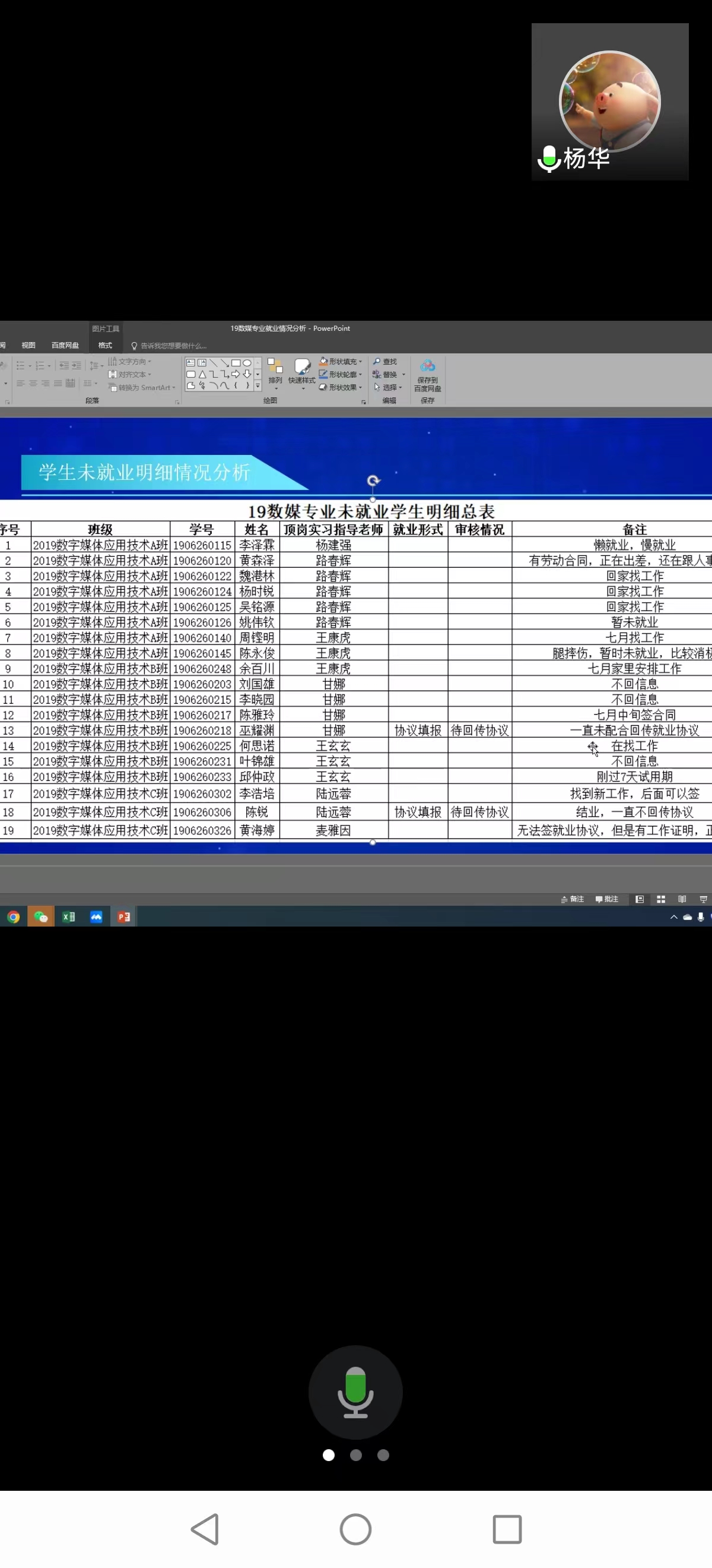 本次专业就业研讨推进会分为两个阶段,第一阶段是学院领导、各专业负责人和毕业班辅导员就业研讨会。通过线上的腾讯会议,各专业负责人按照专业就业率排名进行了汇报,详细介绍了各专业的就业情况。毕业班辅导员也根据所带的专业情况进行了补充发言。学院党总支副书记艾华武针对我院就业的情况提出了相关思路和措施:一是针对签约困难的学生采用灵活就业的形式上报就业,比例控制在10%以下。二是通过访企拓岗活动加大企业联系力度,拓展岗位助力就业。三是拓展就业的形式,加大力度宣传征兵入伍,拓展自主创业等自由职业。四是针对各专业摸查指导老师的就业情况,进行一人一策的困难帮扶。