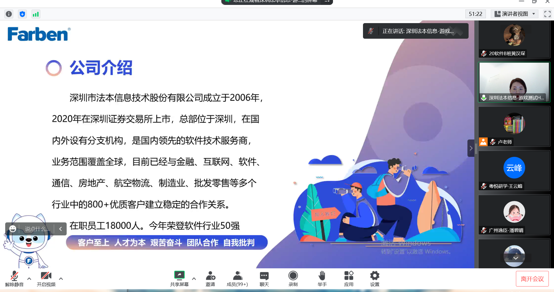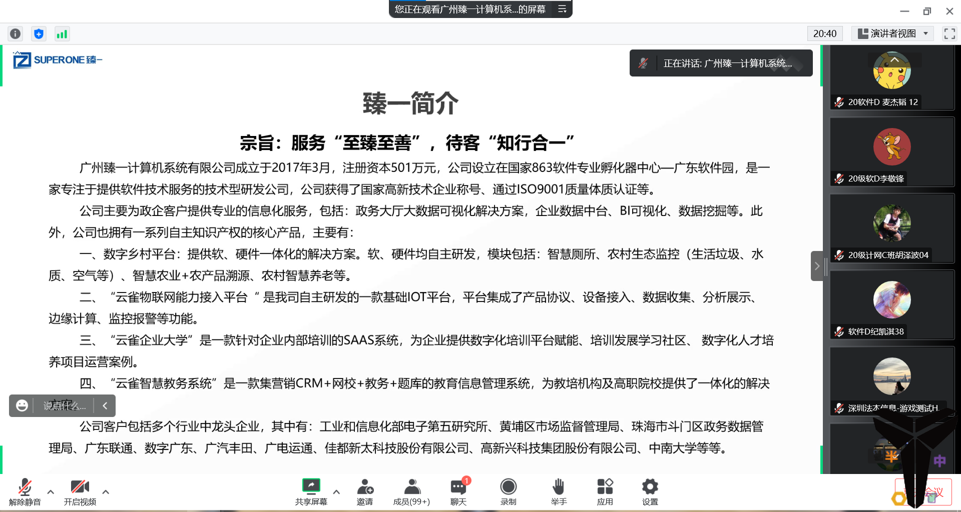 本次网络招聘会共有22个企业参加,筛选了专业对口、信誉好、人企匹配度高的广东臻一计算机系统有限公司、广州市保伦电子有限公司、深圳市法本信息技术股份有限公司等8个企业参加宣讲会。宣讲会上,招聘企业通过PPT展示,向同学们介绍企业概况、人才需求、职业规划发展、企业发展优势等内容,共吸引了超过300名学生参加。