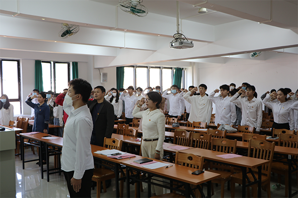 接着由艾华武副书记为5名党员授党徽,再由学生党员陆楚林带领全体成员举起右拳,在鲜红的党旗面前庄严宣誓,高亢激昂,声音久久回荡在教室里。
