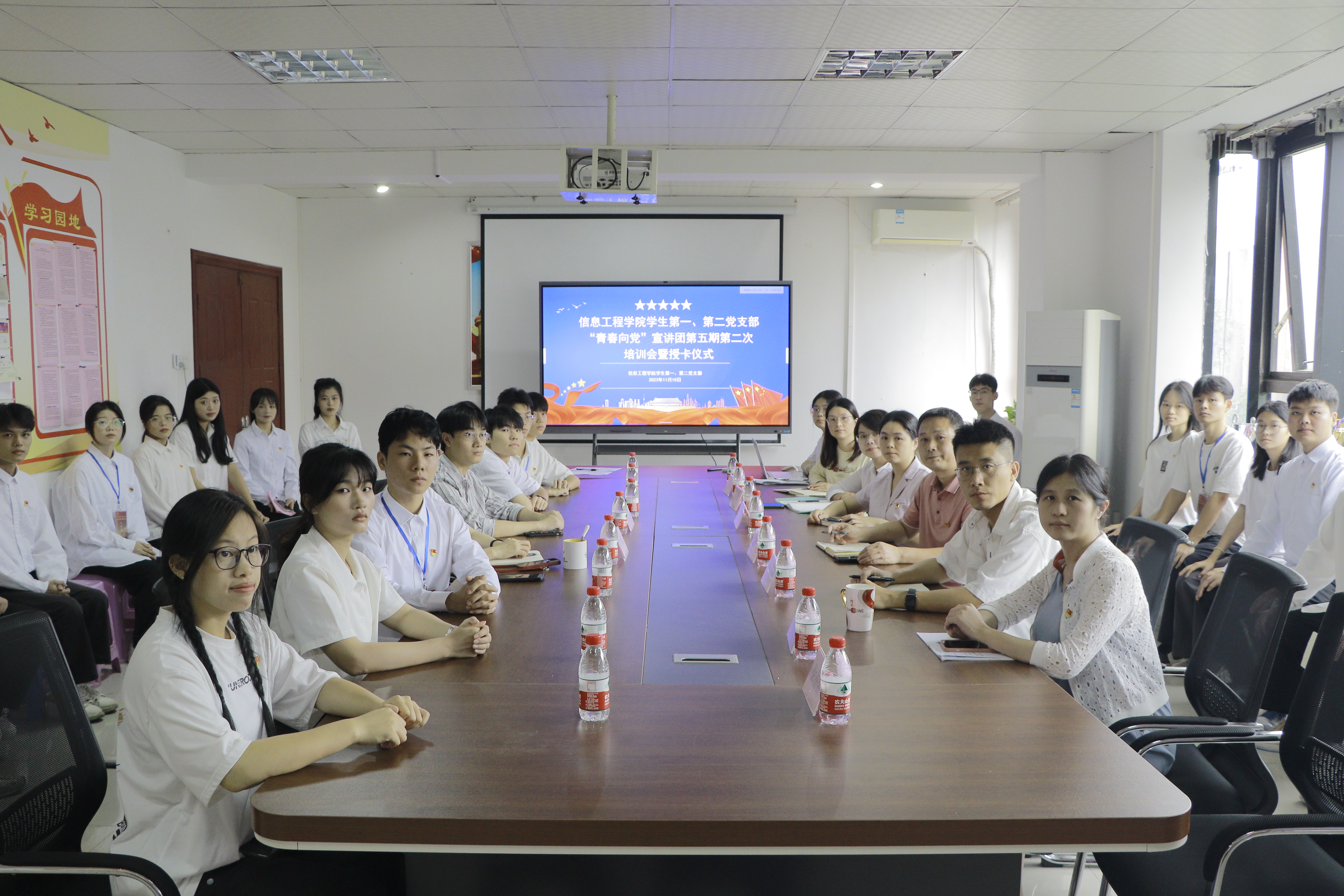 为加强学生党员培训,提升党员党性修养,2023年11月13日中午,信息工程学院学生第一、第二党支部在科技楼308会议室召开“青春向党”宣讲团第五期第二次培训会暨授卡仪式。本次培训会旨在进一步推进宣讲团的工作,提升宣讲团成员的宣讲能力和综合素质,同时对宣讲团成员宣讲内容进行点评,激励宣讲团成员到班宣讲。