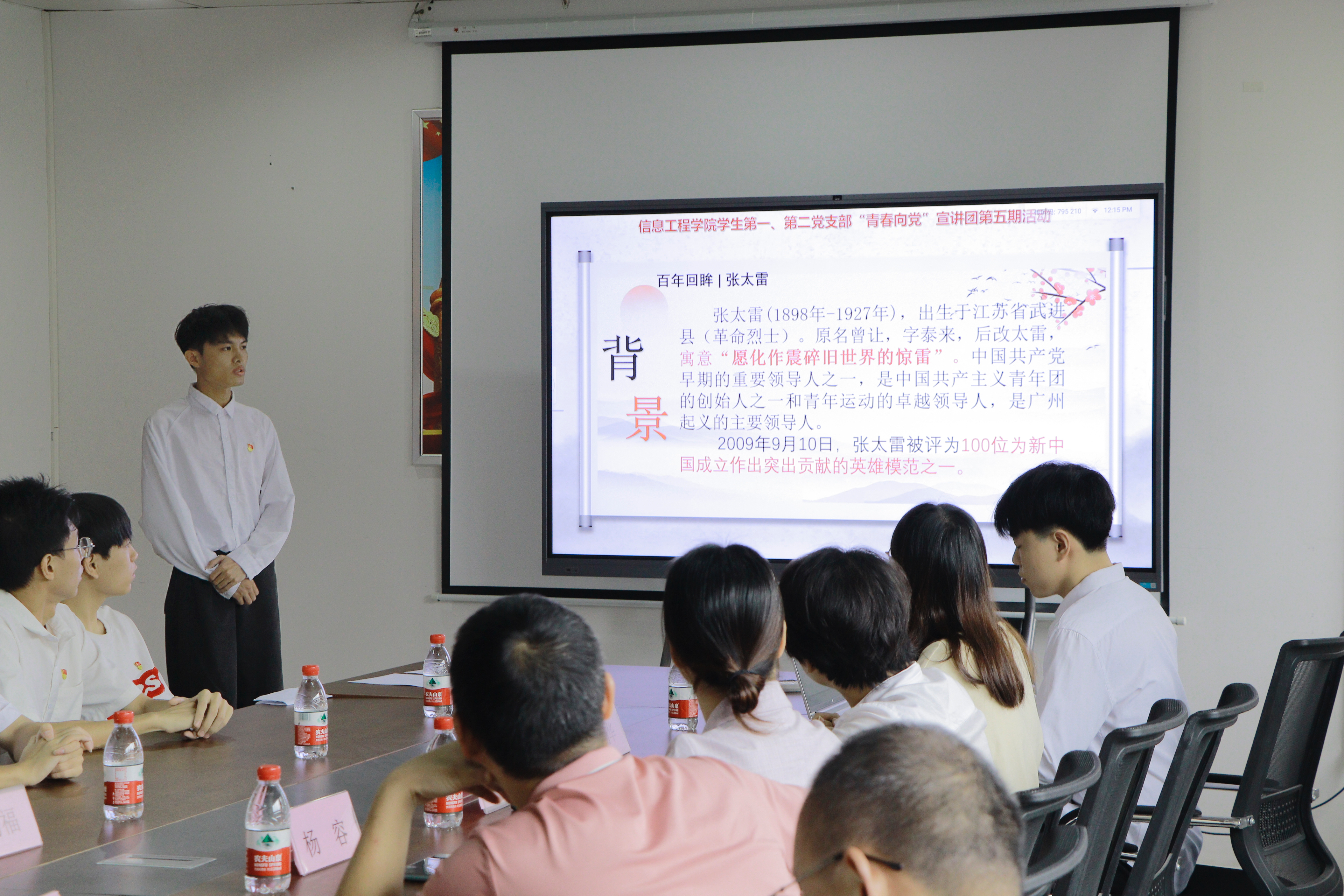 出席本次会议的有信息工程学院党委副书记艾华武,全体学生党支部党员老师以及第五期“青春向党”宣讲团全体成员。会议第一项,由学生第二党支部书记杨容老师进行第一议题领学,领学内容为习近平对宣传思想文化工作作出重要指示强调:坚定文化自信,秉持开放包容,坚持守正创新,为全面建设社会主义现代化国家,全面推进中华民族伟大复兴提供坚强思想保证强大精神力量有利文化条件。杨容老师指出,学生党员应鉴定文化自信,积极弘扬中国传统优秀文化,并从中汲取精神力量。接着由三个小组代表依次上台展示,分别通过周恩来、张太雷、焦裕禄的生平事迹进行宣讲,弘扬廉洁家风,传承红色基因。