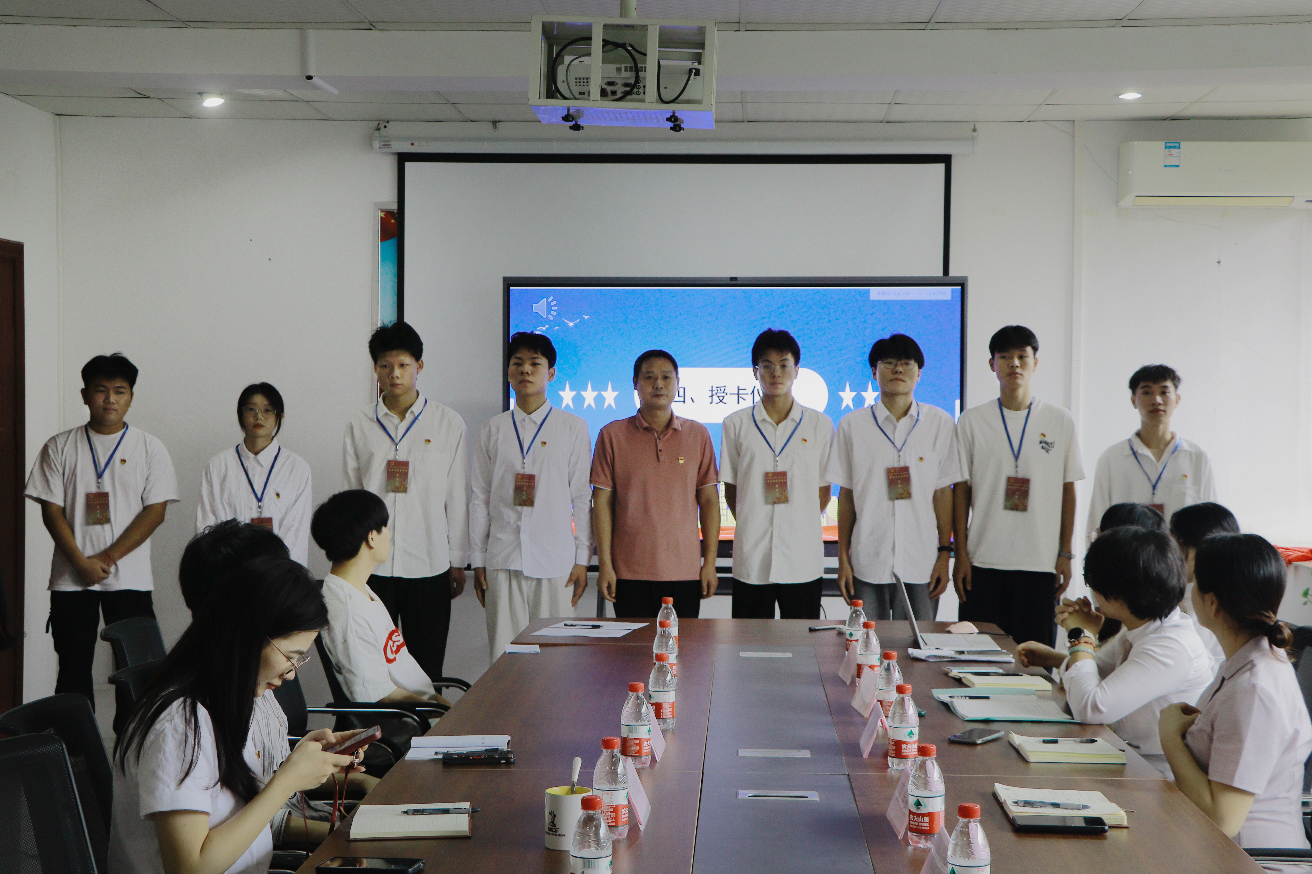 会议第四项,艾华武副书记为“青春向党”宣讲团成员进行授卡。授卡仪式不仅是对宣讲团成员们的认可以及肯定,更是对他们在宣讲工作中寄托的期望。随后由摄影组上台表态,摄影组表示本次的“青春向党”宣讲活动意义重大,整个摄影小组定当全力以赴,配合好各小组的工作,将最好的一面呈现给各位。