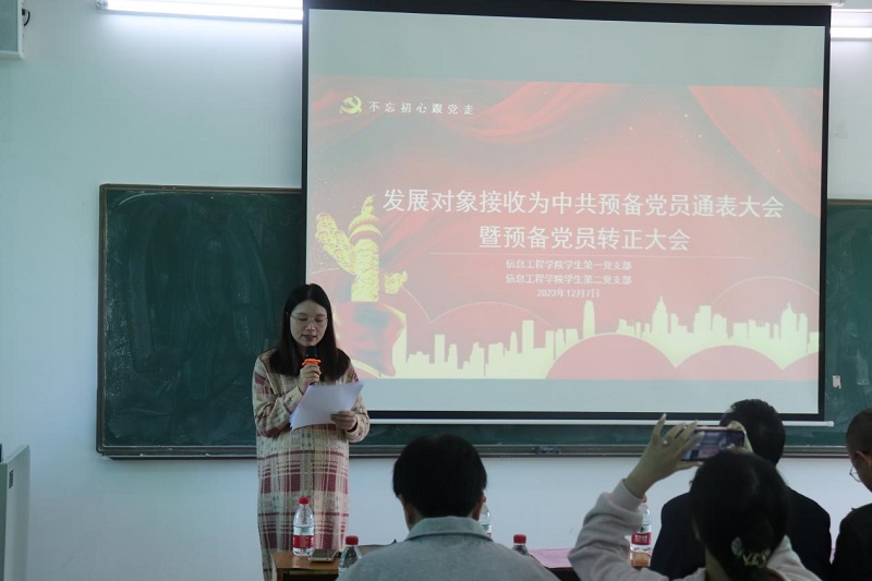 为党的事业发展注入新的力量,2023年12月7日下午,信息工程学院学生第一、第二党支部分别在教1-504、教1-505同时召开发展对象通表大会暨预备党员转正大会。出席本次大会的有学院党委书记桂爱民、党委副书记艾华武、党支部全体党员以及入党介绍人和新一批发展对象。会议分别由第一党支部书记杨华、第二党支部书记杨容老师主持。