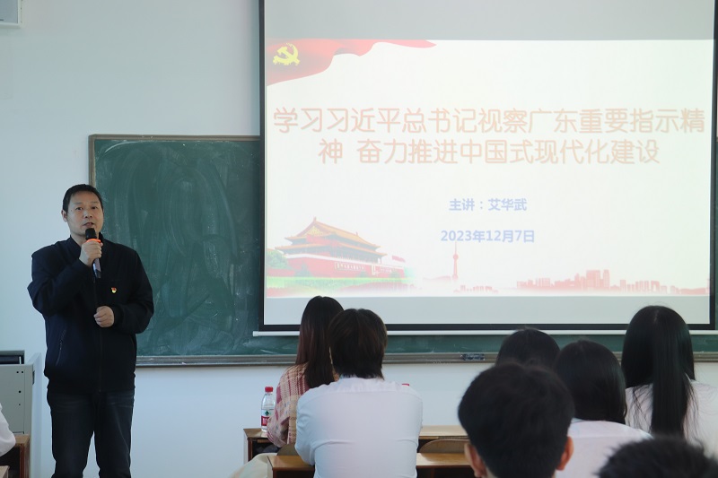 大会结束后,进行了12月份学生党支部的主题党日活动,此次党日活动是由艾华武副书记在教1-504进行开展党课学习,党课上艾书记重点讲述了习近平总书记视察广东重要讲话、重要指示精神,广东“1310”部署,百千万工程。并对全体党员提出六点要求:树立远大理想、热爱伟大祖国、担当时代责任、勇于砥砺奋斗、练就过硬本领、锤炼品德修为,为推进中国式现代化建设而奋斗。
