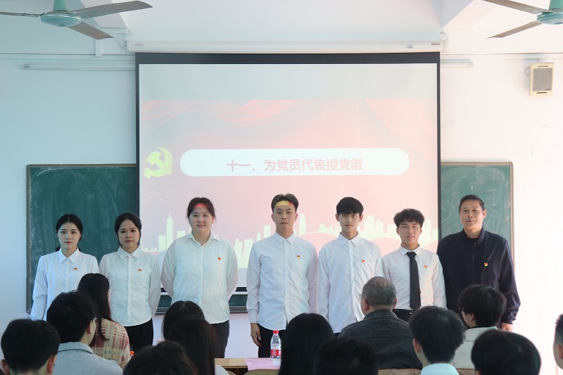 接着两位党支部书记分别在各自会场宣读表决结果,同意卢梓聪等10名预备党员按期转正,吸收为正式党员,同意付鹏等11名发展对象吸收为预备党员。预备党员代表付鹏、姚妍轩分别在各自会场上台发言,她们对党组织的关心和培养表示感谢。接着由艾华武副书记、杨容老师为正式党员授党徽,并给予勉励。最后曾奇锐同志、温广鑫同志分别在各自会场带领大家重温入党誓词。