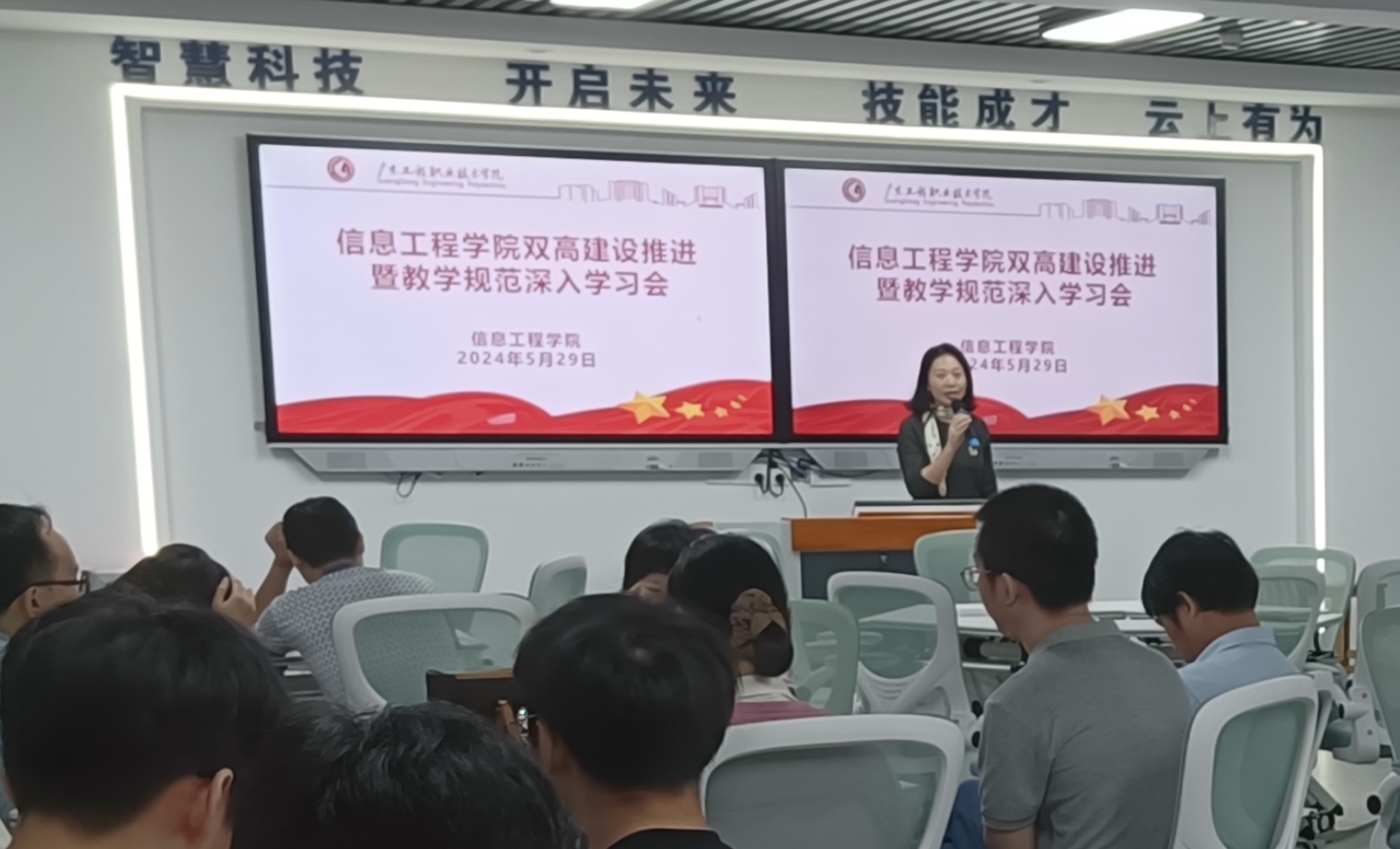 为加快学院内涵式发展和特色化建设,信息工程学院于5月29日召开了双高建设工作推进暨教学规范深入学习会,学院领导以及全体教师参加了本次会议。会议旨在将双高计划的各项任务要求落到实处,同时深入学习教学规范,进一步强化教学规范,全面提升教育教学水平。