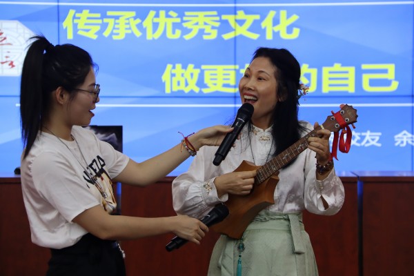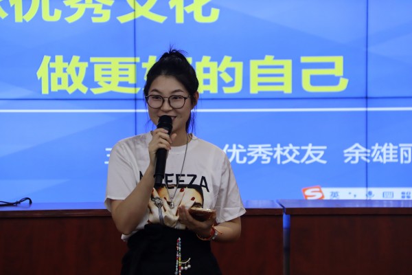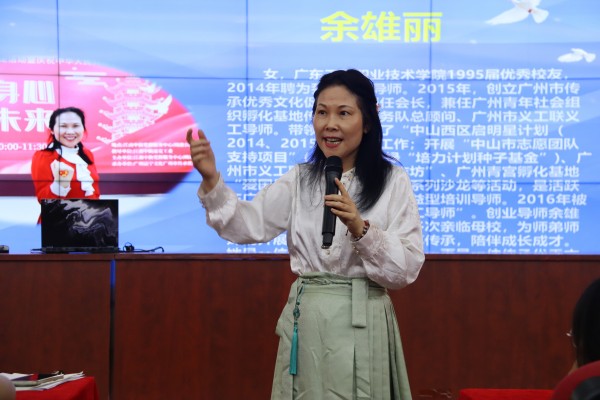 优秀校友余雄丽女士做了主题为“传承优秀文化,做更好的自己”的宣讲。余雄丽女士是1995届财经系财会专业的杰出代表,现任广州市传承优秀文化促进会会长以及广州市义工联义工导师。她以二十余年如一日的热情,致力于青年综合素质提升和文化传承事业。在分享中,余老师从现场弹唱歌曲《龙的传人》切入主题,讲述她的个人经历到分享他人经历,并分享了她在文化传承和公益事业中的心得与感悟。她表示,作为新时代的青年,应该不忘初心,积极传承和弘扬中华优秀传统文化,为社会的繁荣与发展贡献自己的力量。余雄丽女士的分享赢得了在场师生的阵阵掌声,她的热情和坚持也深深感染了每一个人。