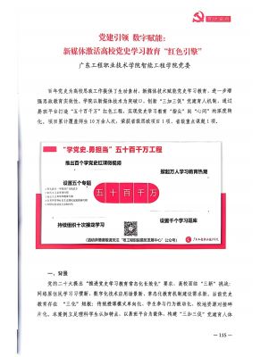 近日,广东省职业院校党建工作优秀案例评选结果揭晓,我院智能工程学院党委申报的党建工作案例《党建引领 数字赋能:新媒体激活高校党史学习教育“红色引擎”》成功入选2025年度广东省职业院校党建工作百优案例,彰显了学院在党建创新与实践中的突出成效,成为我校基层党建工作的又一重要成果。