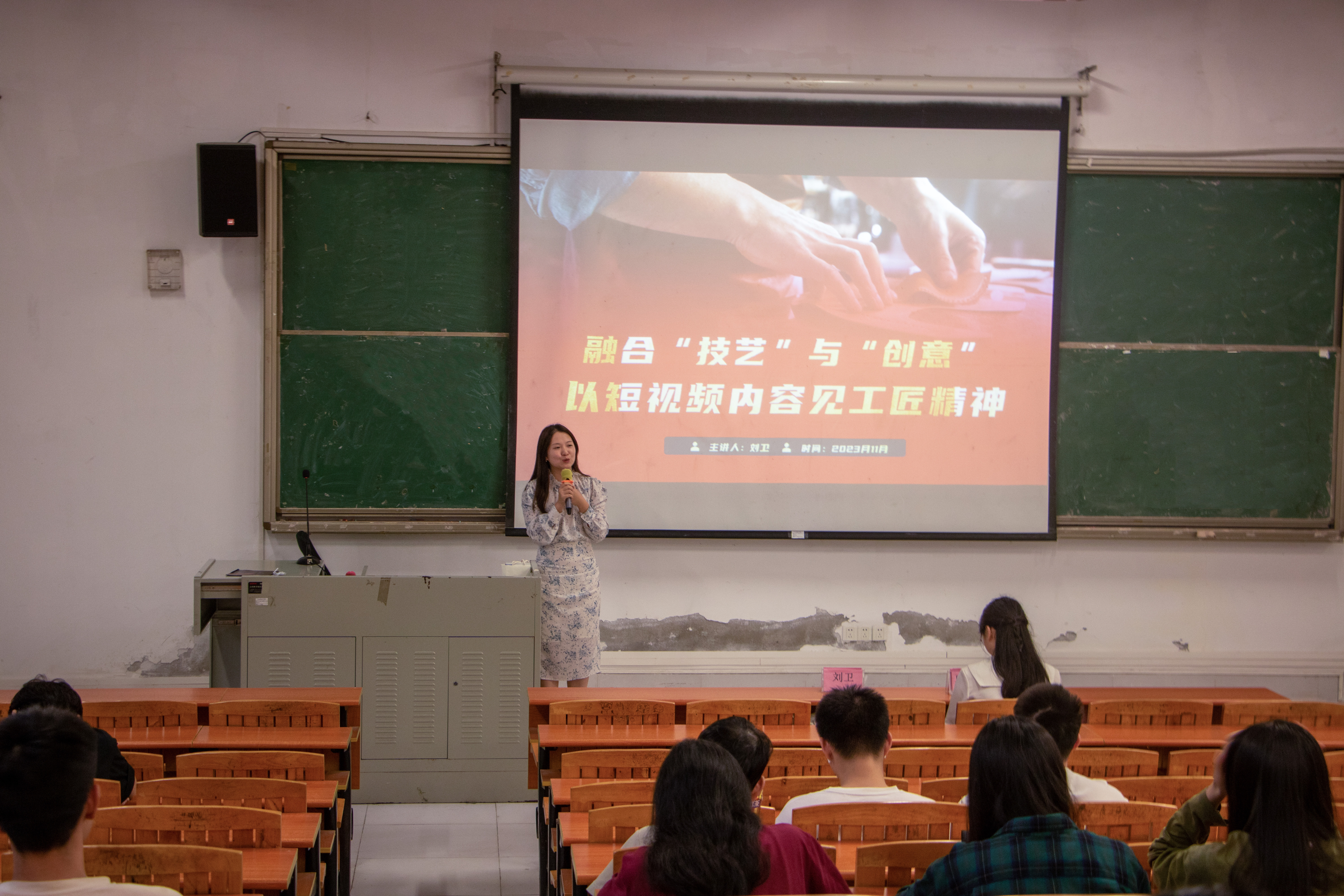 本次讲座聚焦于短视频如何展现和传递工匠精神,旨在探讨在快节奏社会中,如何通过短视频形式展现传统工匠精神的内涵和价值。在讲座上,主讲人刘卫老师通过自身学生时代的经历切入主题,引发同学们对工匠精神的思考,并且展示了现在网络上以短视频发扬工匠精神的热门作品。她表示抖音博主煎饼果子创作的《逃出大英博物馆》系列短视频作品之所以能迅速火爆出圈,主要是因为博主以艺术手法呈现了流落海外文物的处境,凝聚了深切的民族情怀,同时短视频与文物融合后,巨大的流量也可以让更多人关注文化价值,珍视文物。此系列短视频是“技艺”与“创意”高度融合的典范,也为自媒体创作者树立了良好的榜样。接着刘卫老师分享自己在传承工匠精神上的经验和实践,勉励同学们要培养专注之心,才能具备聚焦匠心的精力,要培养精进的思维,同时要多肯定自己,为自己提供愉悦的体验,才能战胜负能量。并建议同学们要多参加比赛,提升自己的专业技能,培养一颗执着专注、精益求精、一丝不苟、追求卓越的匠心。