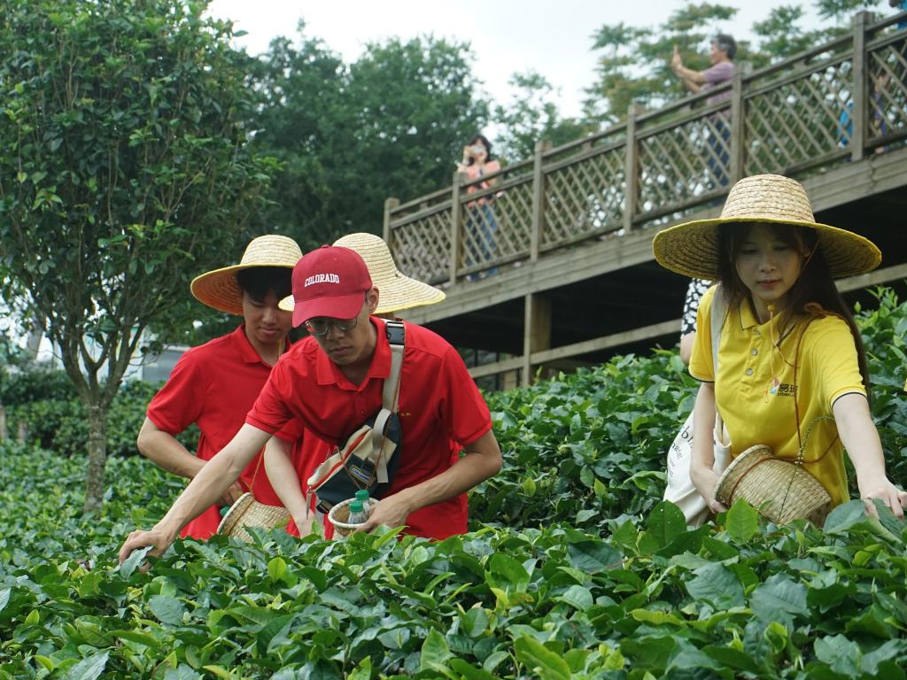 体验摘茶制茶,感悟劳动精神。全体师生前往英德茶趣园,工作人员介绍了茶趣园景区的概况,讲解了茶的种类,采茶的注意事项等等,师生们戴上竹笠,背上茶篓,亲自在茶园采茶,拿着自己亲手采摘的鲜茶青,在制茶师傅的指导下亲手动手揉茶、晾茶,炒茶等茶叶手工制作的整个过程。师生们沉浸式体验采茶、炒茶、品茶、赏茶等劳作课程,体验亲自劳动带来的乐趣。师生们通过一系列的沉浸式的劳作,深入了解茶文化,感受茶文化的熏陶,体会到中华传统文化的博大精神,感悟到伟大的中华儿女在世世代代辛苦劳动中凝结的智慧结晶,感慨中国全力推动乡村振兴带来的巨大变化和辛勤劳动人民的伟大劳动精神。