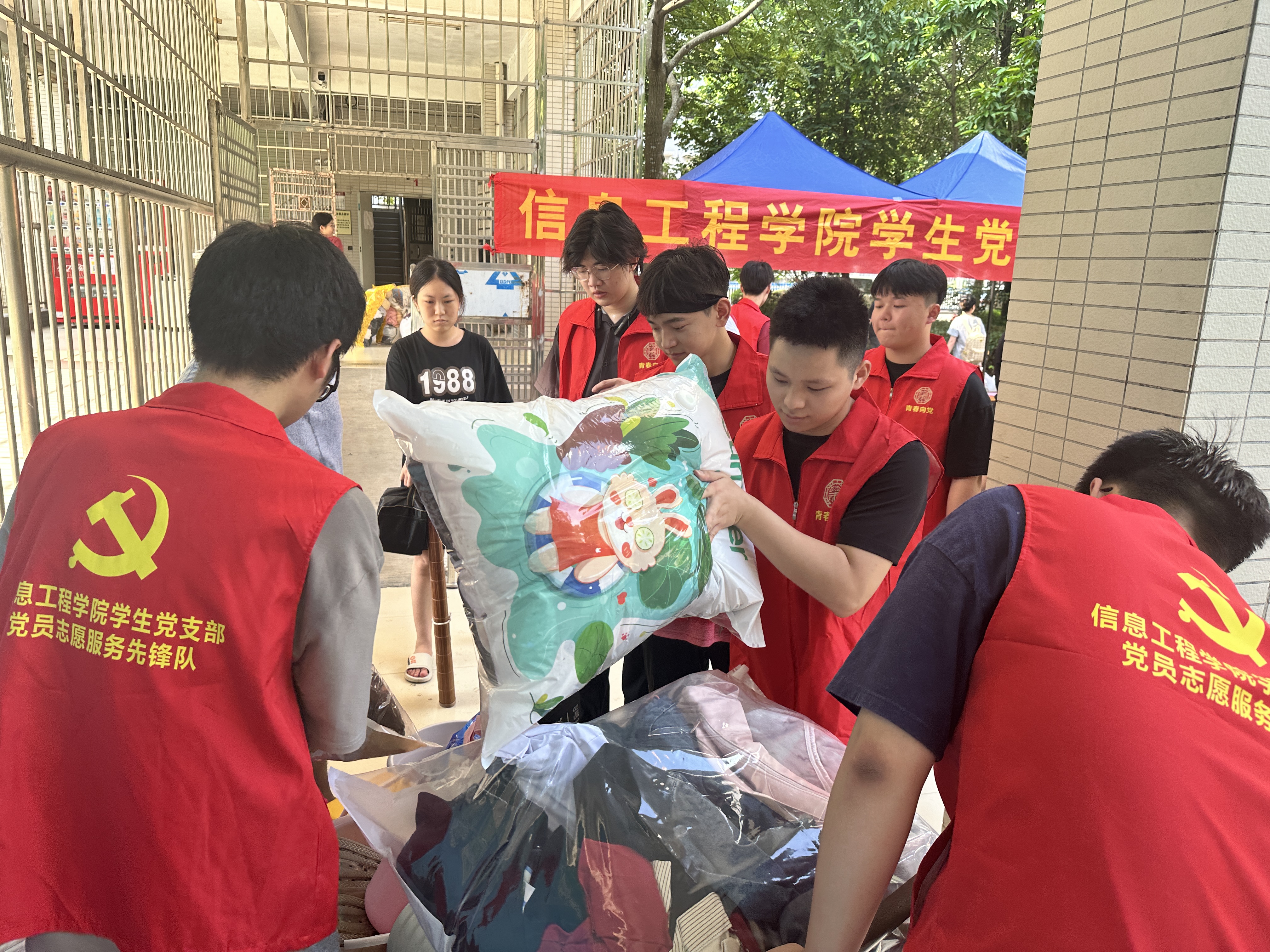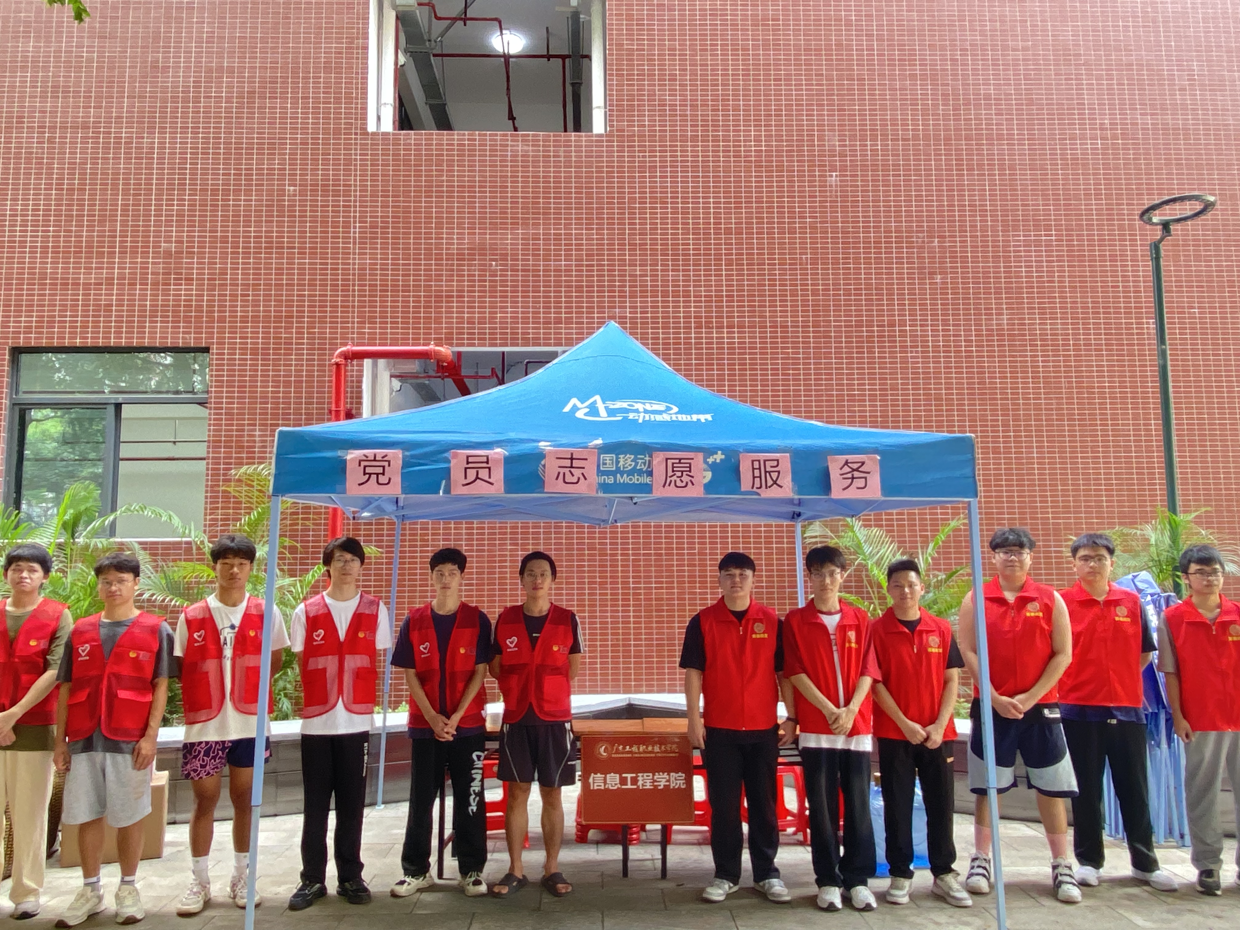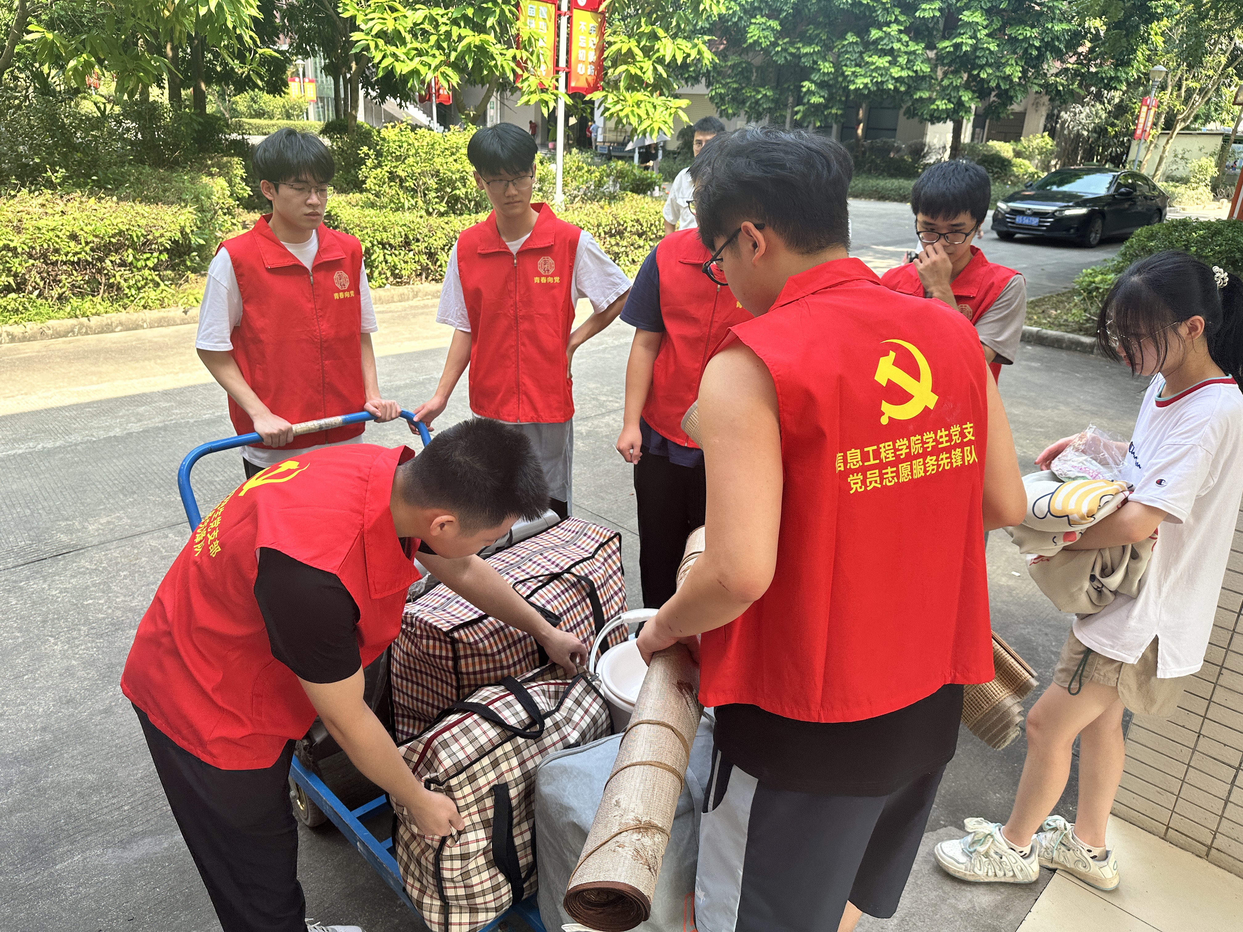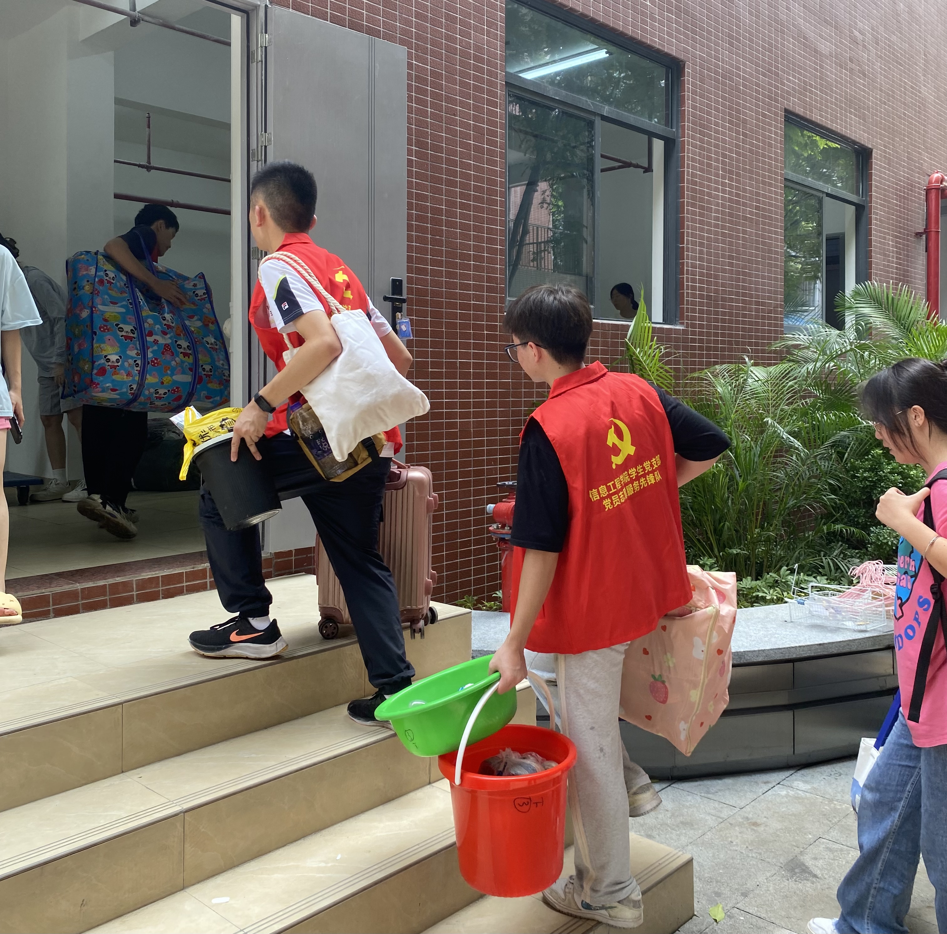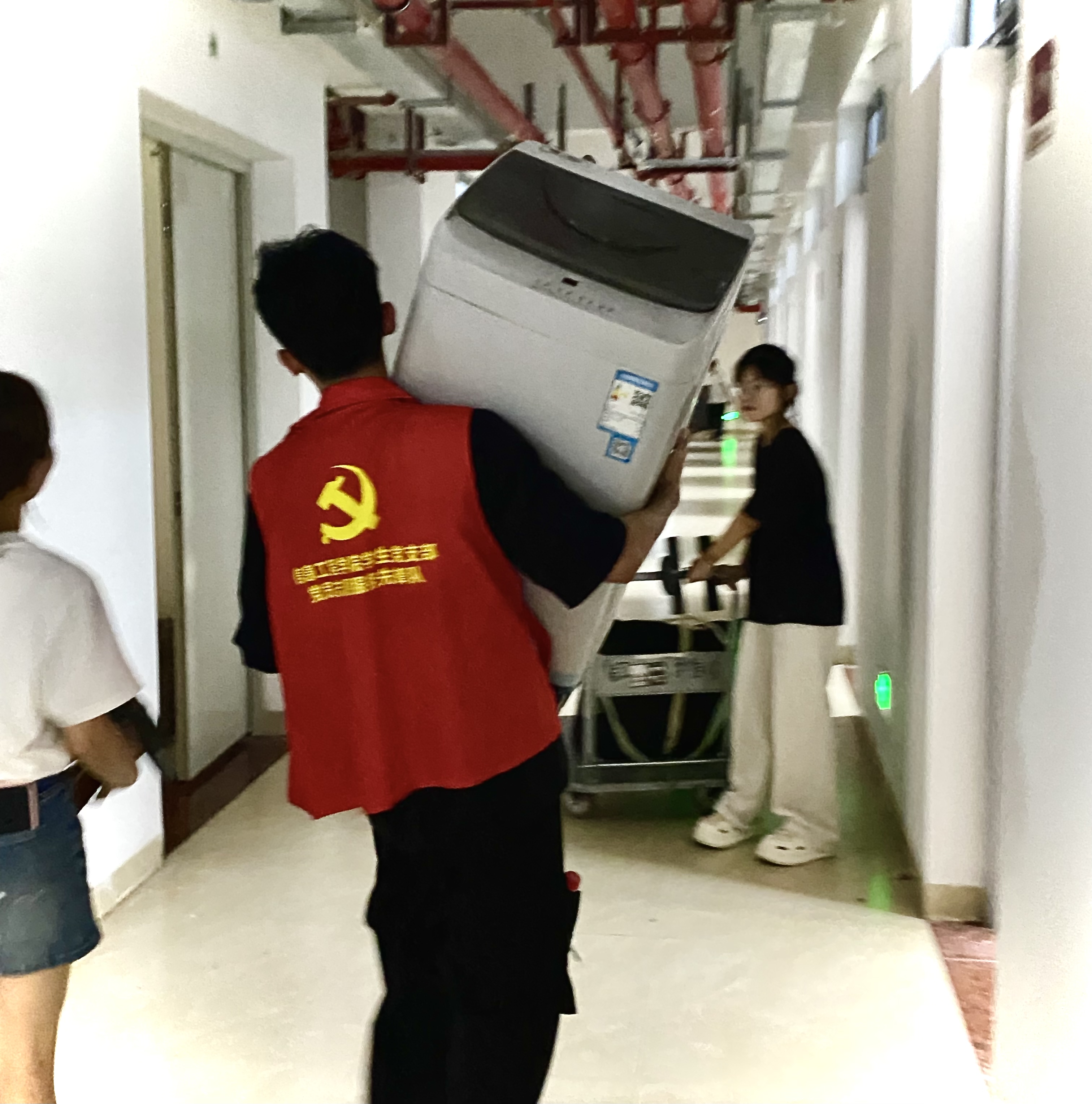 为了更好的服务到女同学,参加志愿服务的同学们于8月28日提前五天返回学校。8月29日当天,‌信息工程学院学生党支部分别在8栋楼下和11栋楼下设置服务站,做好行李暂存,看管,协助搬运重物和提供饮水等服务,其他志愿者分别安排到宿舍楼层中,协助女生打包和搬运行李。尽管天气炎热,‌但志愿者们依然热情高涨,‌他们身穿统一的志愿者服装,‌穿梭于各个宿舍楼之间。在搬迁过程中,‌志愿者们相互协作,‌共同面对各种挑战。‌面对沉重的行李和狭窄的楼道,‌他们或背或扛,‌或抬或拉,‌确保每一件行李都能安全稳妥地送达新宿舍。‌汗水浸湿了他们的衣衫,‌但他们的脸上始终洋溢着笑容,用实际行动诠释了“奉献、‌友爱、‌互助、‌进步”的志愿者精神。