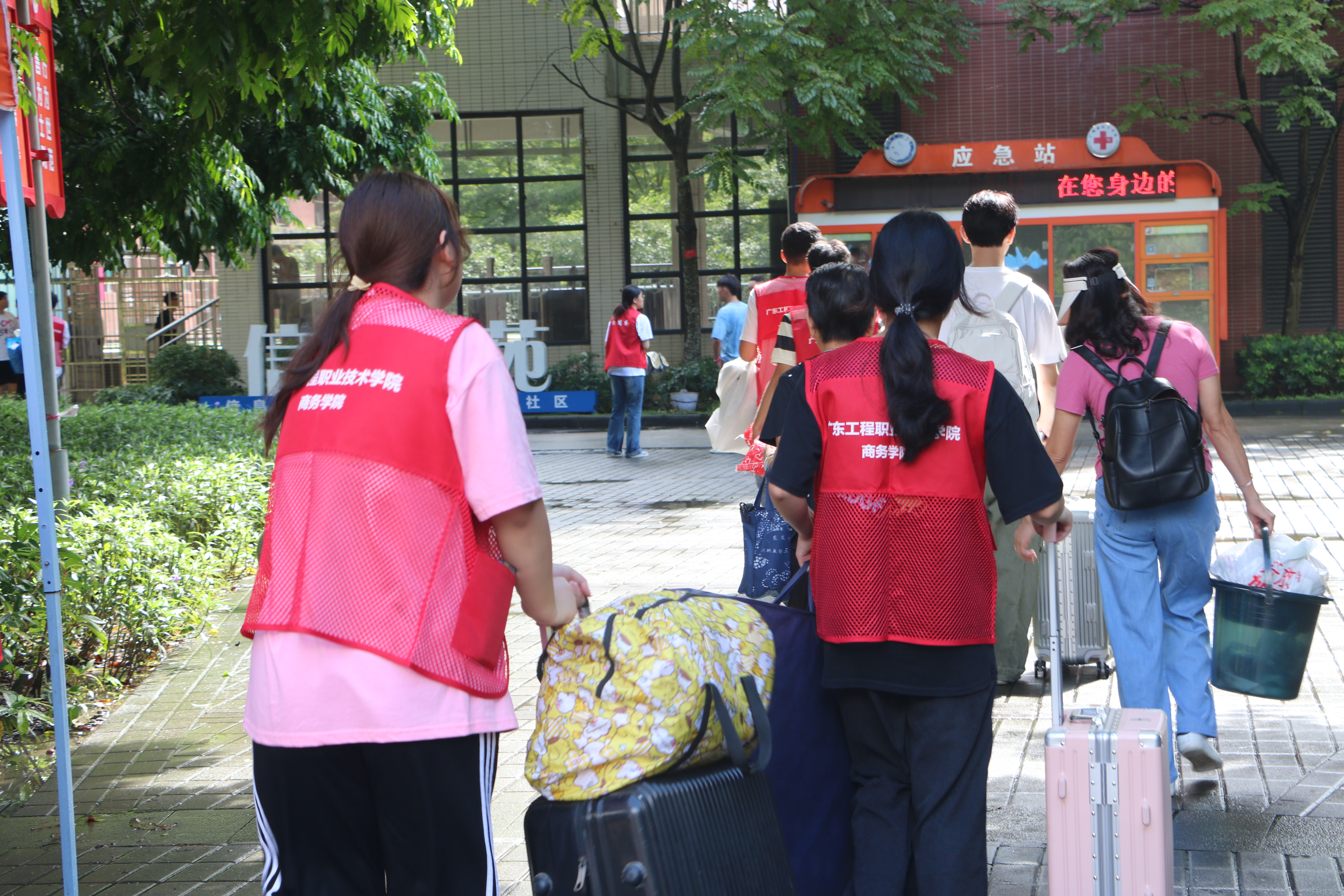 清晨 7 时,身着红马甲的迎新志愿者在科技楼架空层严阵以待。尽管雨丝飘落,但他们热忱不减,冒雨迎接新生及家长,提供贴心服务,让新生感受温暖与友爱。志愿者和党员同学坚守岗位,展现立信文化精神风貌,为新生开学第一天护航。
