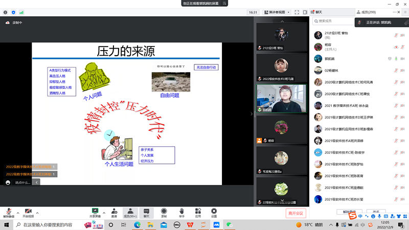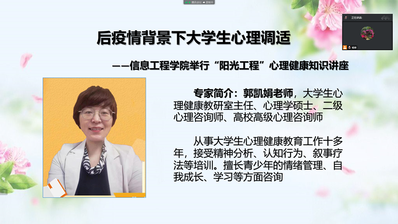 为进一步提高大学生的心理素质,宣传普及心理健康知识,帮助同学们调节情绪,适应后疫情下的学习和生活。2022年12月9日中午,信息工程学院邀请了学生工作部大学生心理健康中心负责人郭凯娟老师通过线上的方式举行“阳光工程”心理健康知识讲座,讲座主题为:后疫情背景下大学生心理健康调适——如何处理家庭关系。讲座吸引了300名同学参加,活动由杨容老师主持。